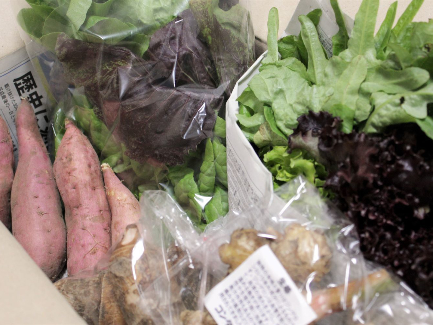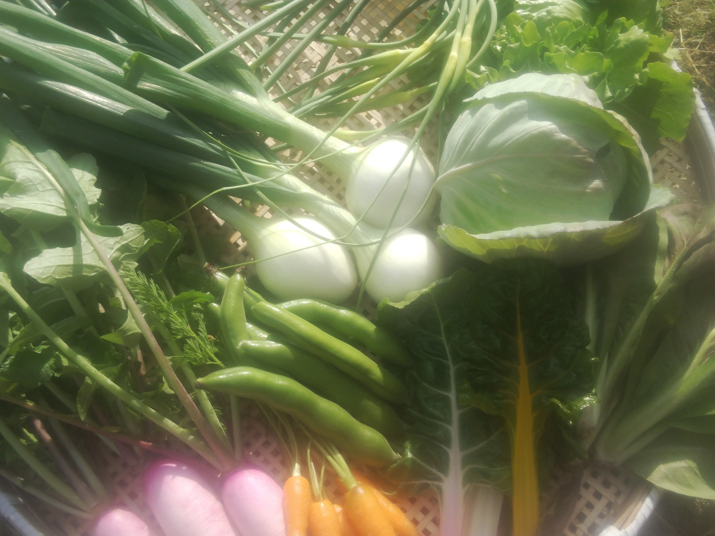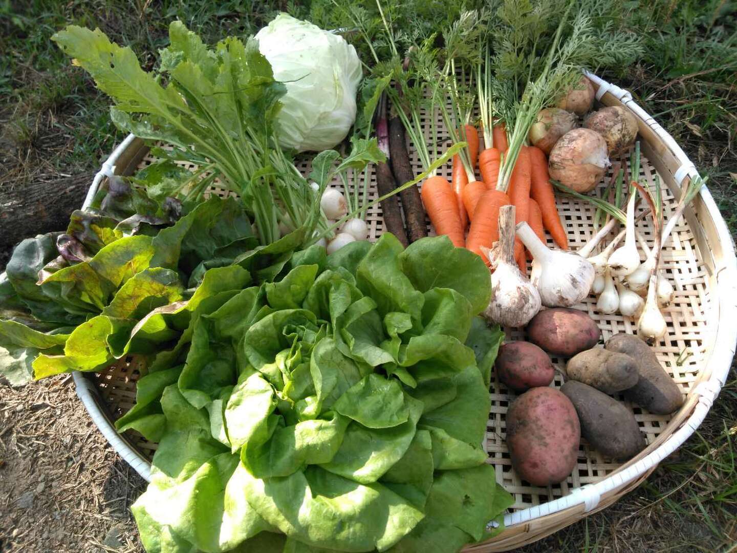 6月全半分(らっきょう、ニンニク、葉付き人参、平鞘インゲン、サラダ菜、玉ねぎ、小カブ、ミニキャベツ、トレビス、牛蒡、じゃがいも等)