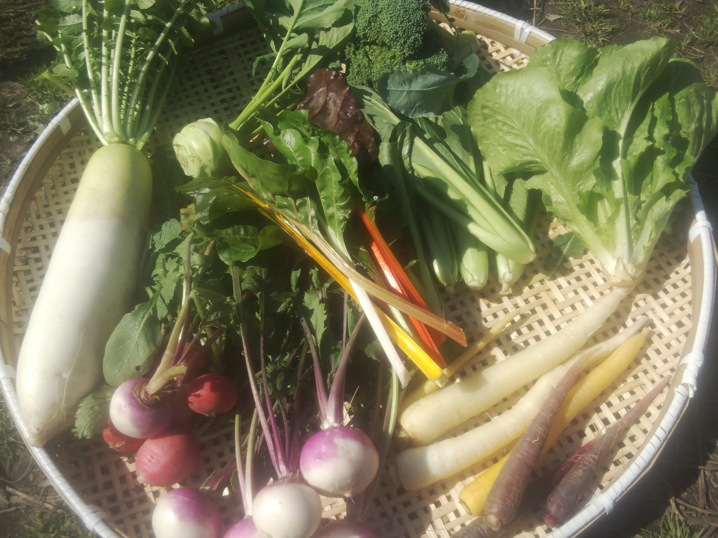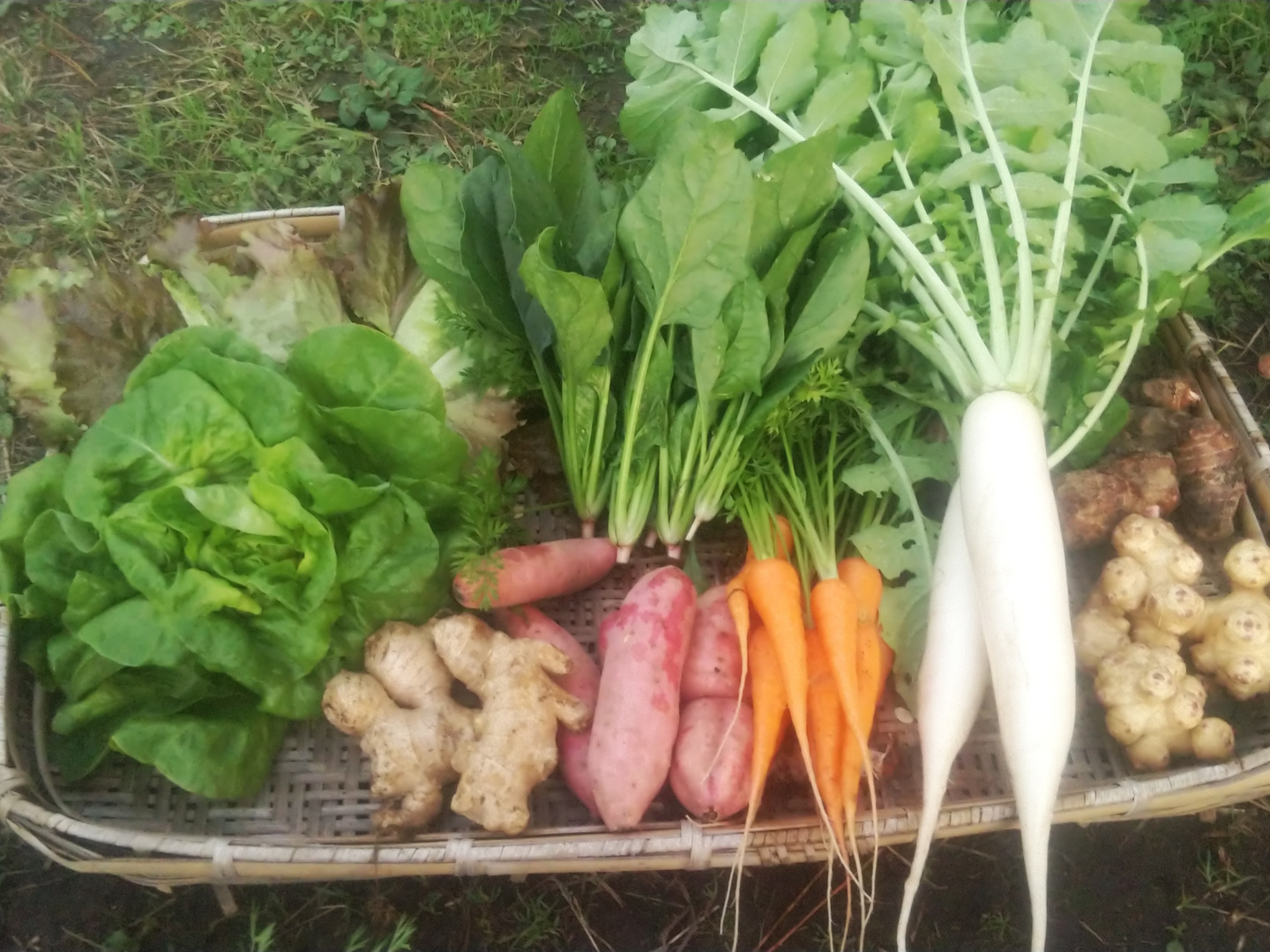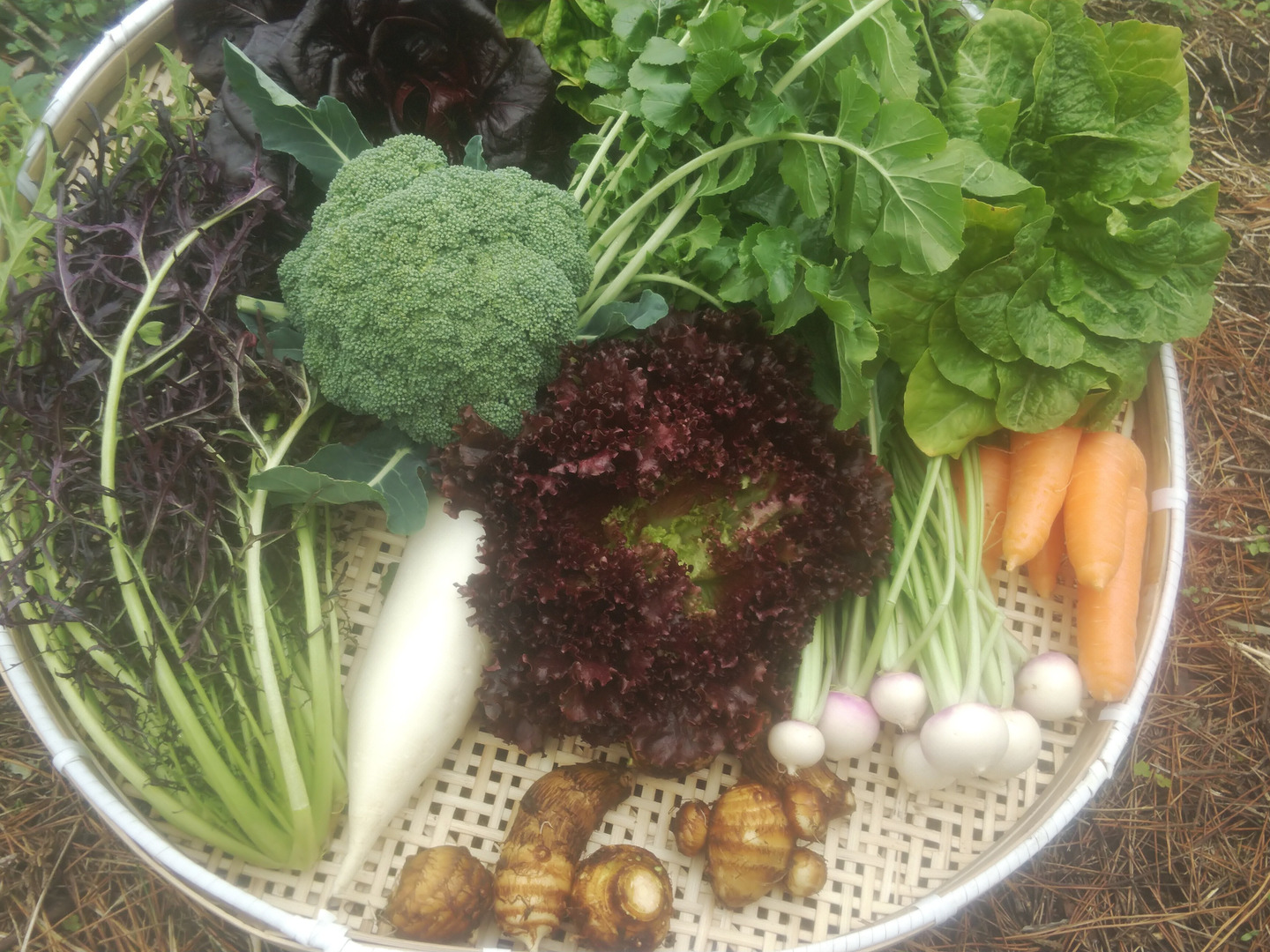 6月全半分(らっきょう、ニンニク、葉付き人参、平鞘インゲン、サラダ菜、玉ねぎ、小カブ、ミニキャベツ、トレビス、牛蒡、じゃがいも等)