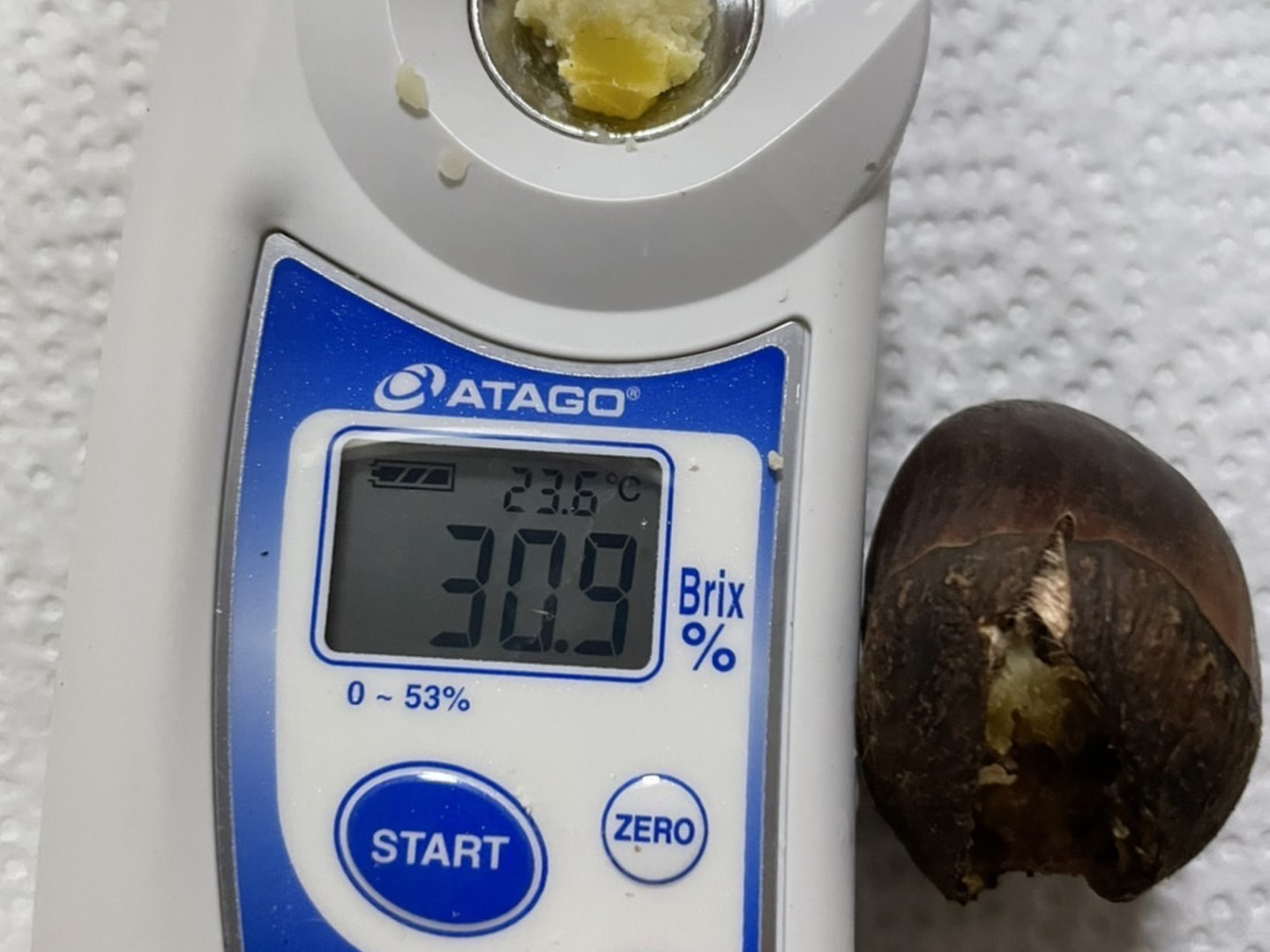 また化学肥料は使用しておりませんので意図的に大きくできません。3Lサイズ(3.9~4.9㎝)の栗は50粒にひとつ、4Lサイズ(5cm以上40g)の栗となると100粒に1つ、あるかないか。