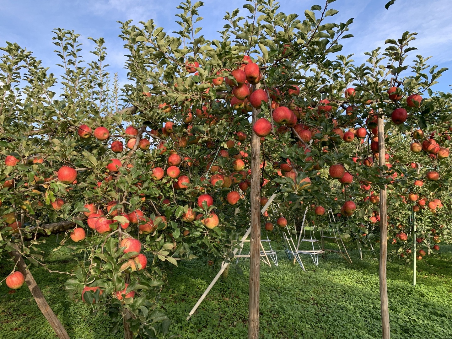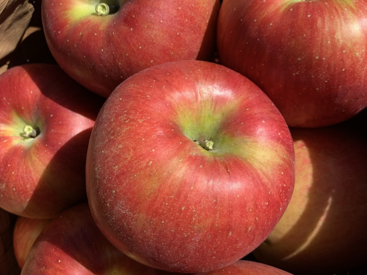シナノスイートは、りんごの女王「ふじ」と夏のりんご「つがる」を親にもつ、長野で生まれたオリジナル品種。強い甘味をもつ「つがる」と、甘味と酸味のバランスが秀逸な「ふじ」、どちらも人気のりんごの良いとこどりをした、いわばりんご界のサラブレット。果汁の量も多く、当園でも人気のりんごです。