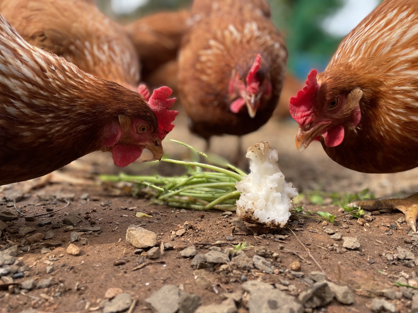 日中は自由に放牧地で地面をついばみ、季節の緑餌(りょくじ:草や青菜など)や、野菜、フルーツなどを食しています。