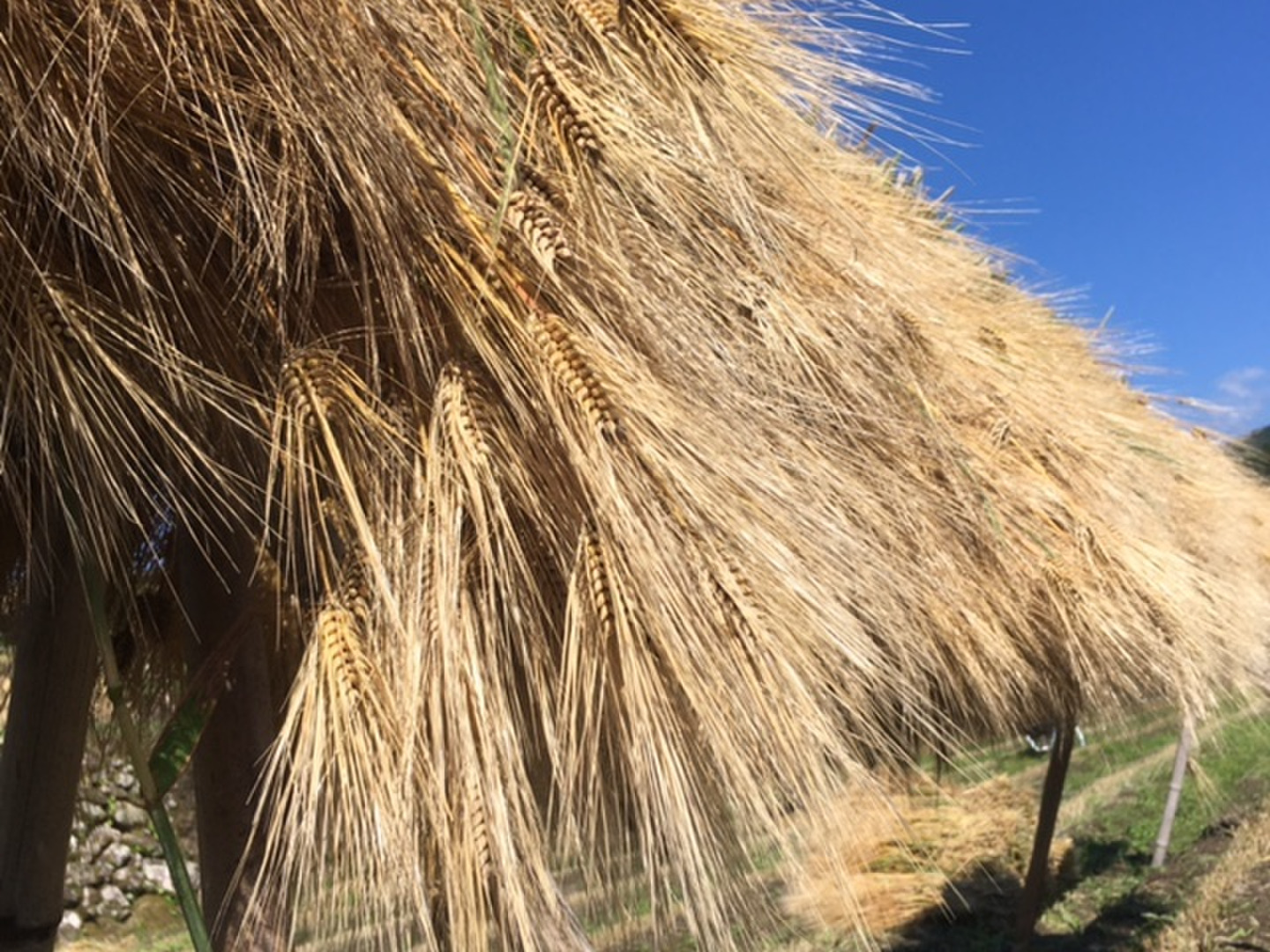 化学農薬または化学肥料を使用せず大切に育てた六条大麦「シュンライ」を収穫後、大麦では全国でも大変珍しい稲架(ハザ)がけ天日干します。(稲架がけ天日干しは、穂を下にして天日に干すことにより麦わらの成分が穂に集まり旨味や栄養素が増すといわれています)