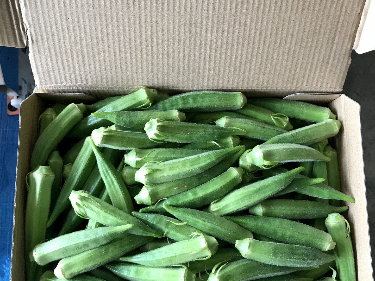 鹿児島産のオクラ注文を受けてから、収穫日に収穫した箱込み1キロ前後を畑の空気も収穫しながらAB品大中小混合箱詰めして、当日発送します^_^