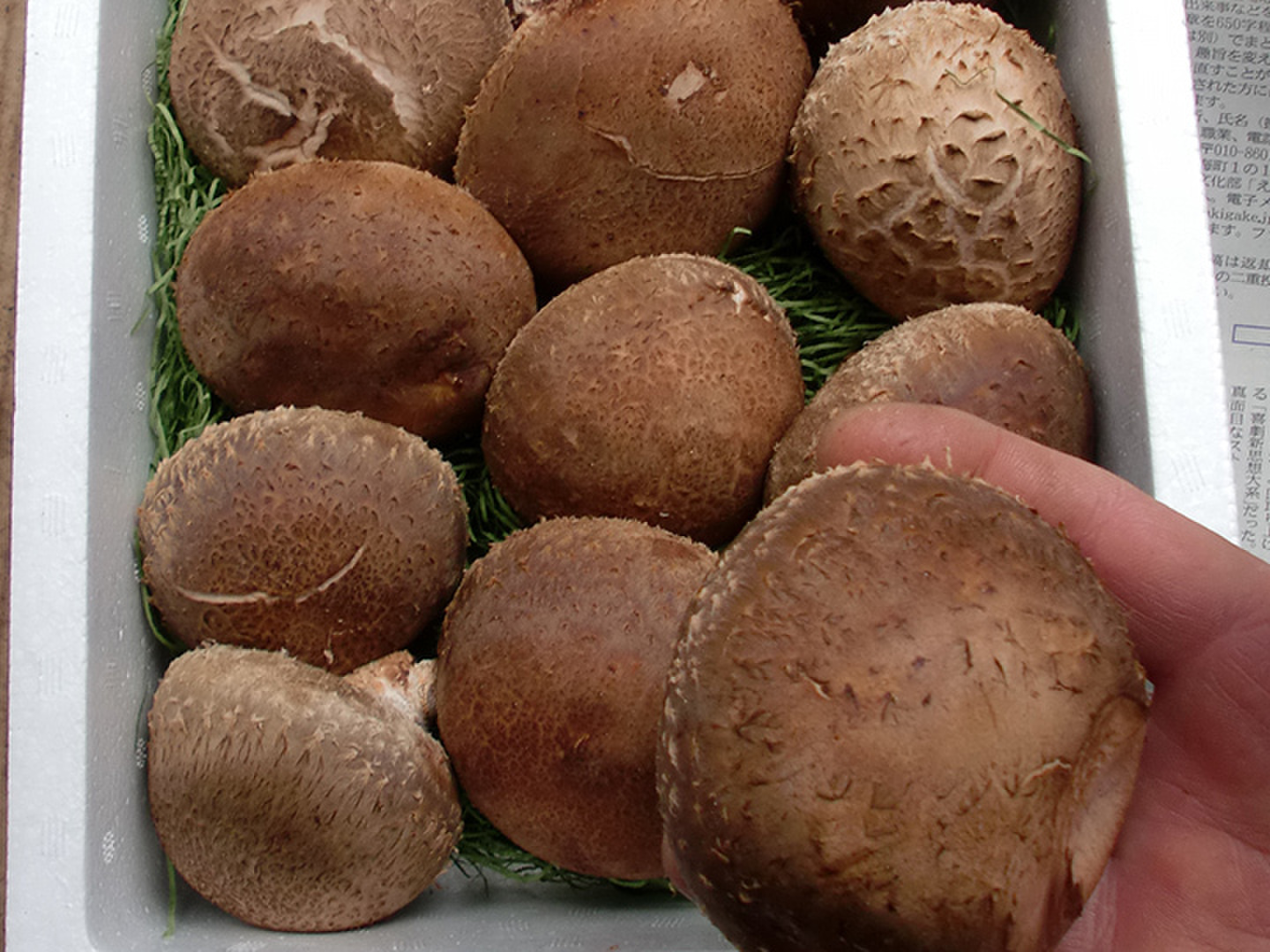 通称、「ジャンボ椎茸」と呼ばれていて、肉厚の大きな椎茸です。この椎茸は冬場の厳寒気に無加温のビニールハウスの中で生長します。親指大から直径7~8センチまでになるまで約一月ほどかかります。そして、厳寒期に生長するため、いわゆる「寒じめ」栽培ができ、焙って食べるだけで甘さを感じます。そういう意味では希少価値の椎茸といえます。