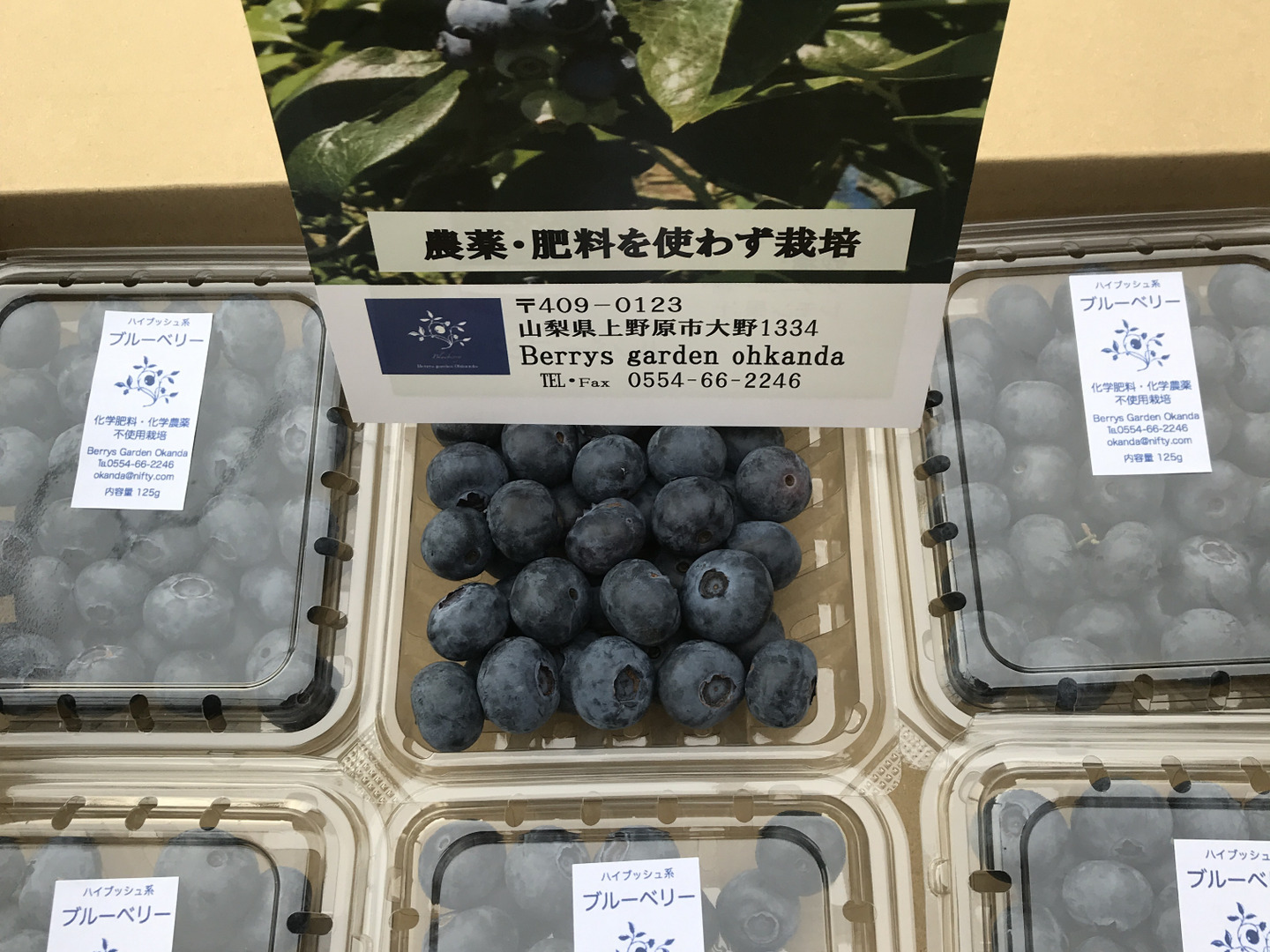 専属農場「Berrys garden ohkanda]で自然栽培された朝摘みのブルーベリーは一粒一粒手摘みし選別して贈答用にも対応する125g入りパックを6パック箱入でお届けいたします。