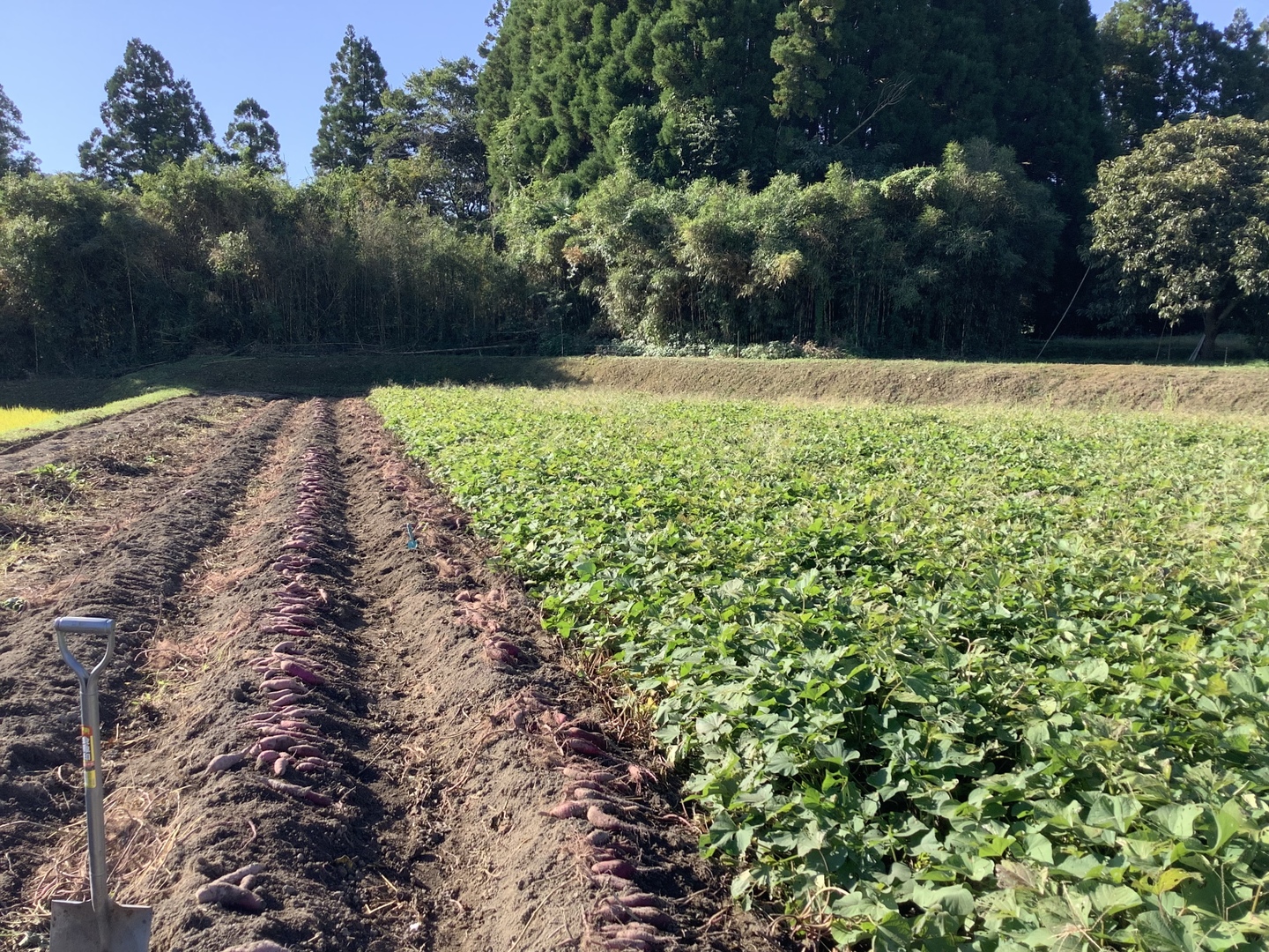 熊本の里山の畑で育てました。路地栽培のサツマイモ、紅はるかです。マルチをはると草取りは減りますが、やはり美味しいサツマイモを収穫したいので、マルチははらない露地栽培にこだわりました。
