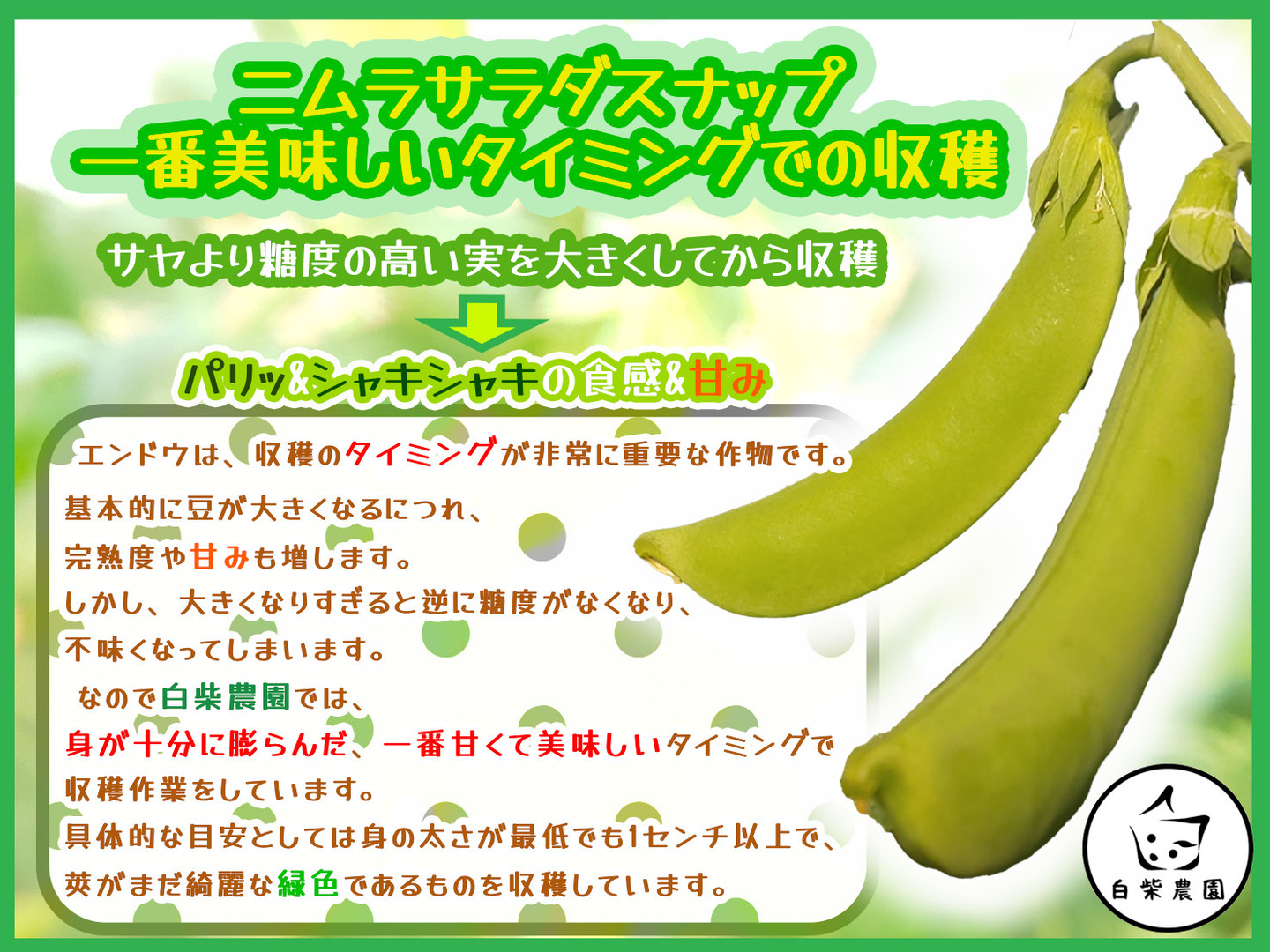 なので白柴農園では、身が十分に膨らんだ、一番甘くて美味しいタイミングで収穫作業をしています。具体的な目安としては身の太さが最低でも1センチ以上で、莢がまだ綺麗な緑色であるものを収穫しています。