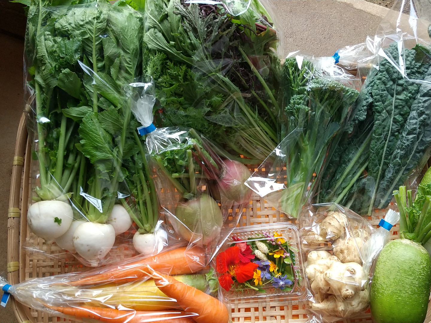 葉付きミニニンジン、ニンニク、ミニゴボウ、キュウリ、ナス、ズッキーニ、ケール、ジャガイモ、その他季節に対応します。