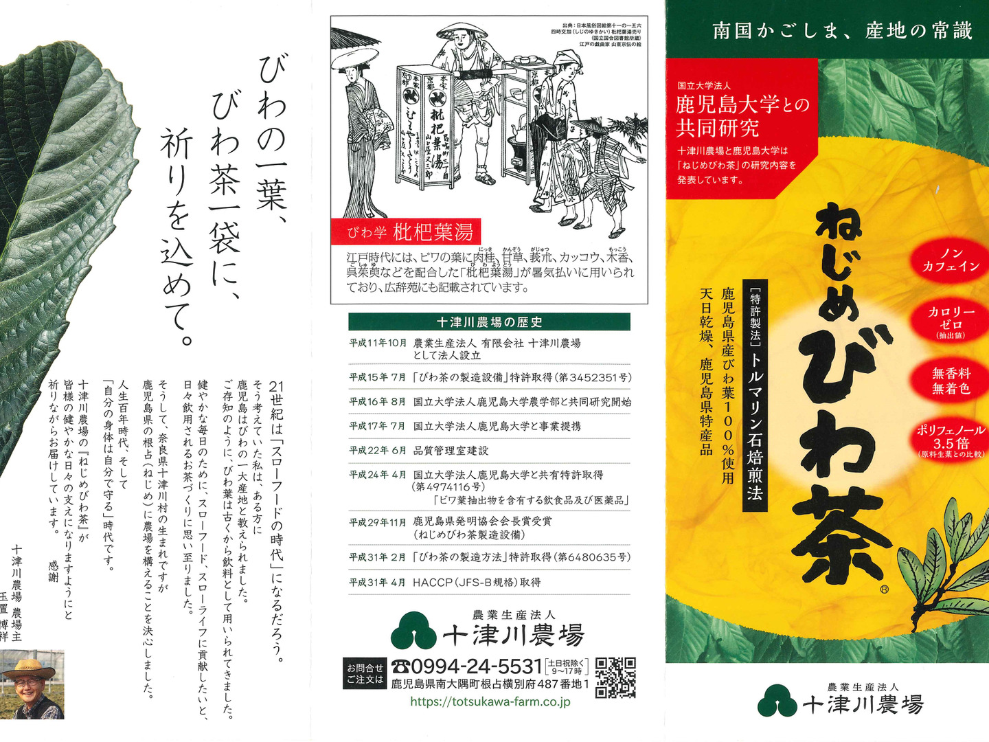 鹿児島県産びわの葉だけを使い、唯一無二の独自の特許製法でほんのり芳ばしくまろやかな味わい、さらにすっきりとした喉ごしになるようにつくりました。