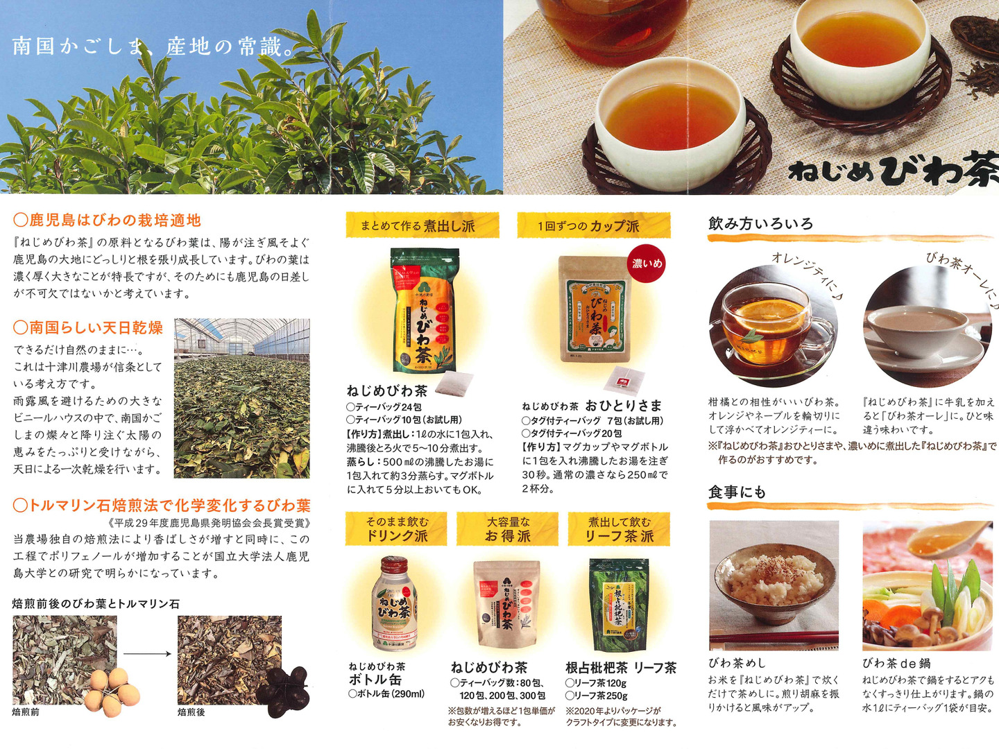 1包で1Lつくってお家でたっぷり飲める「ねじめびわ茶10包入」、デスクワークやほっと一息したい時にすぐつくれる「ねじめびわ茶おひとりさま7包入」、リラックスしたい時にびわ茶入りハーブティーの「伝承びわ茶17包入」。
