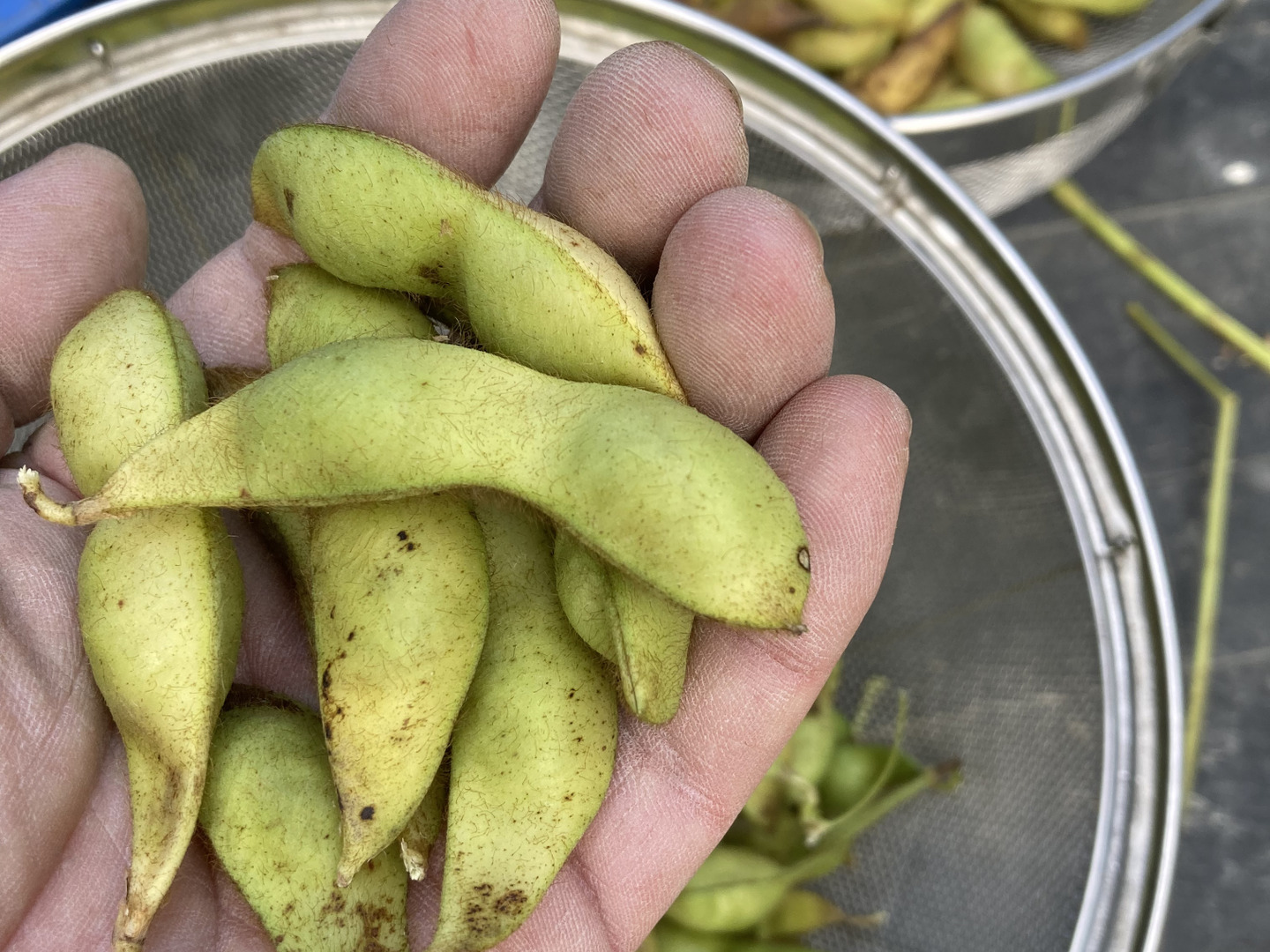 僕の畑は冬の畑作りに納豆菌を含む堆肥を用い、害虫対策には最低限の農薬を使用しています。ただ、害虫繁茂の原因は、雑草が蔓延り、風通しが悪くなることにもあります。除草剤は使用せずに、腰を屈め草を引いています。実は草引きが一番大変💦黒豆=苦労豆💦