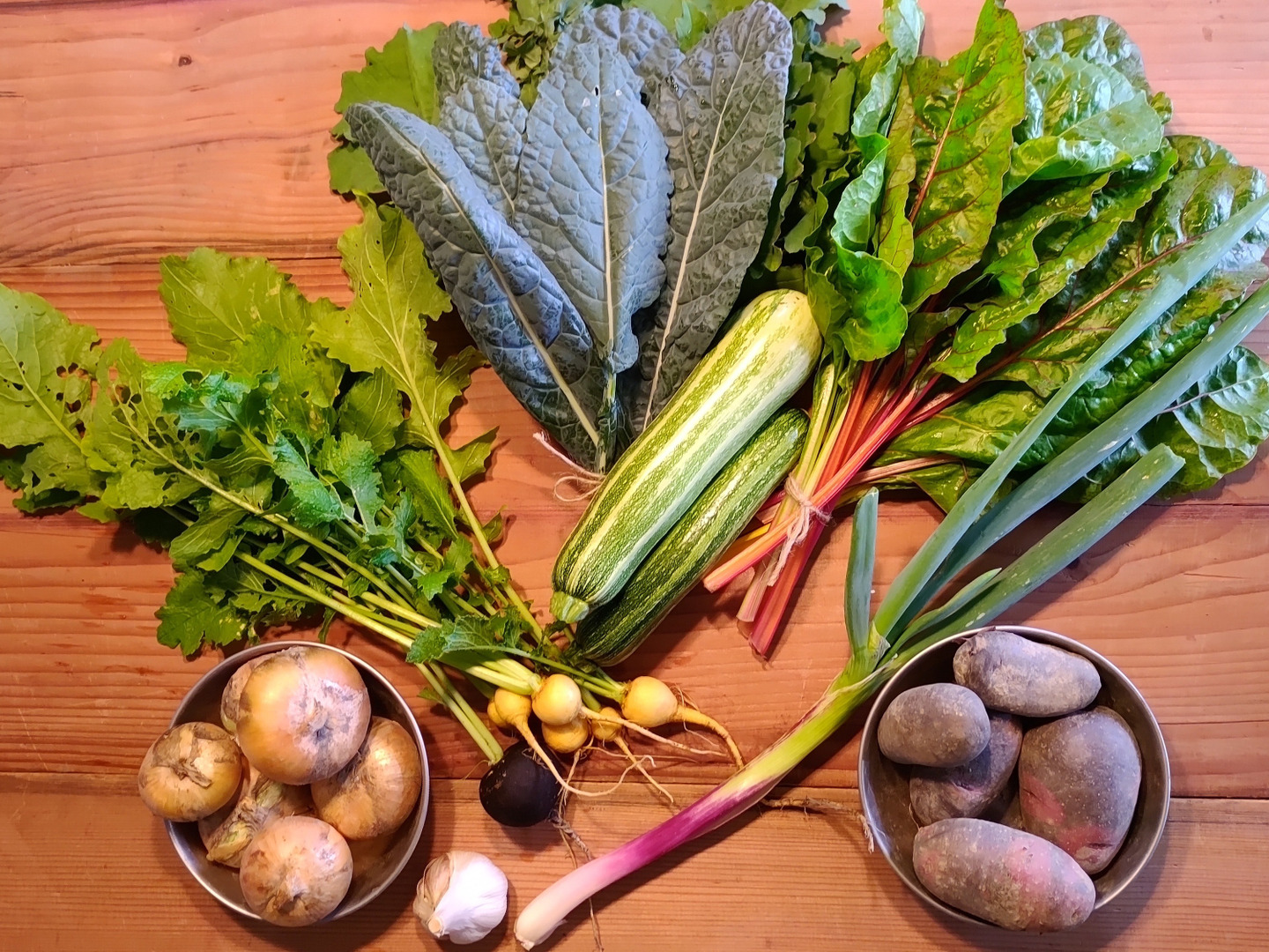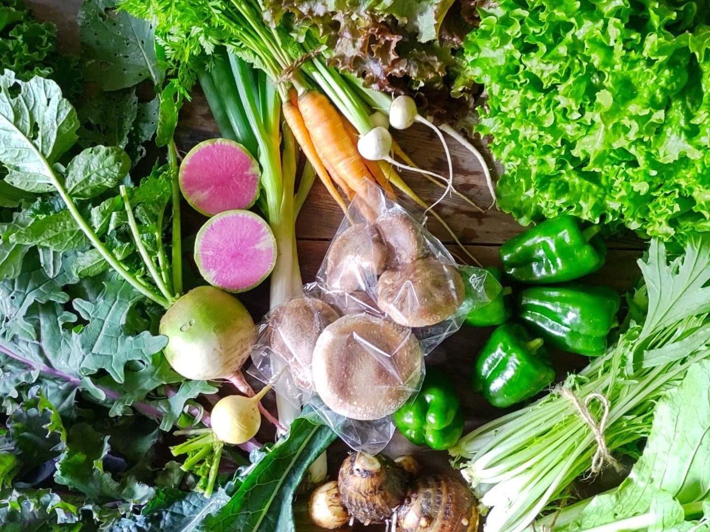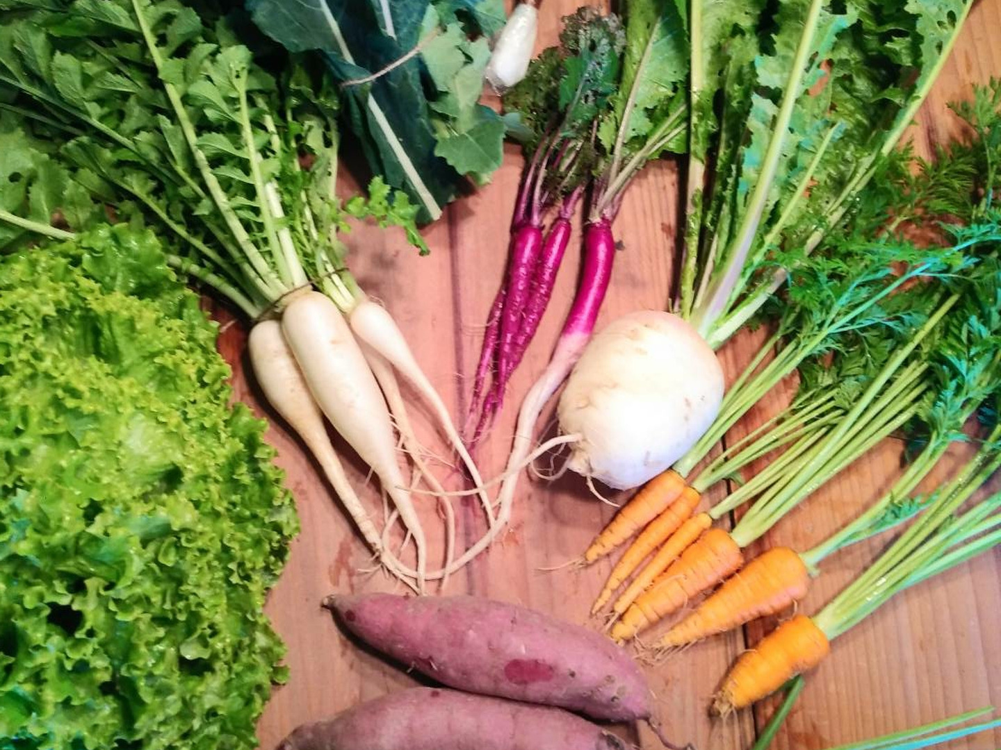品目例:さつまいも、水菜、からし菜、小松菜、里芋、菊芋、人参、原木しいたけ、人参、かぶ、ケール、サニーレタス、水菜、壬生菜、山東菜、長ねぎ、じゃがいもなどからそのとき採れるものをおまかせで7品程度詰め込んでお贈りします。