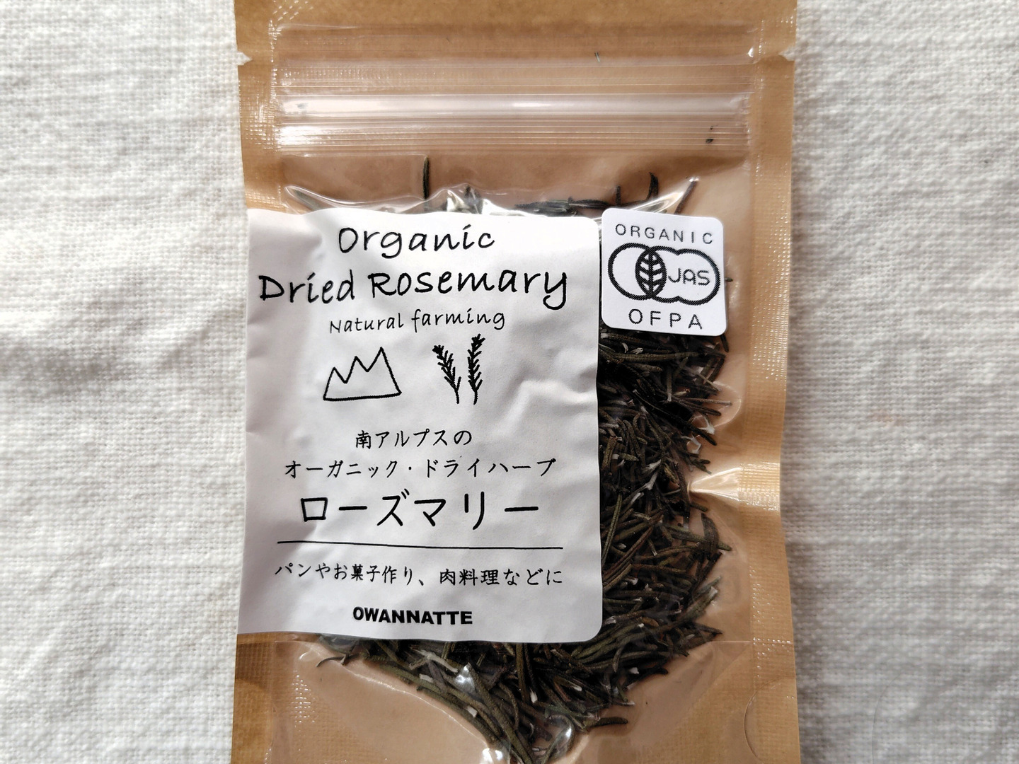 有機JAS基準のオーガニックかつ、農薬・化学肥料不使用の露地栽培で、南アルプスの冬を乗り越え、強い日差しと風を浴びながら力強く育ったローズマリーのワイルドで爽やかな中に甘い香味、ほろ苦さがあります。香味が強いため、少量で十分お楽しみいただけます。