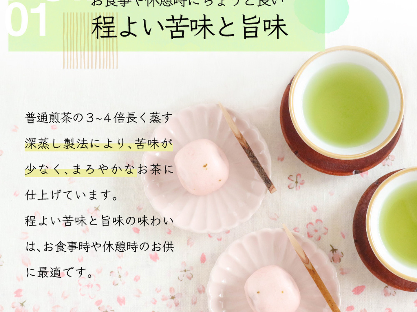 深蒸し茶は普通煎茶に比べ、蒸し時間を倍近くかけて、