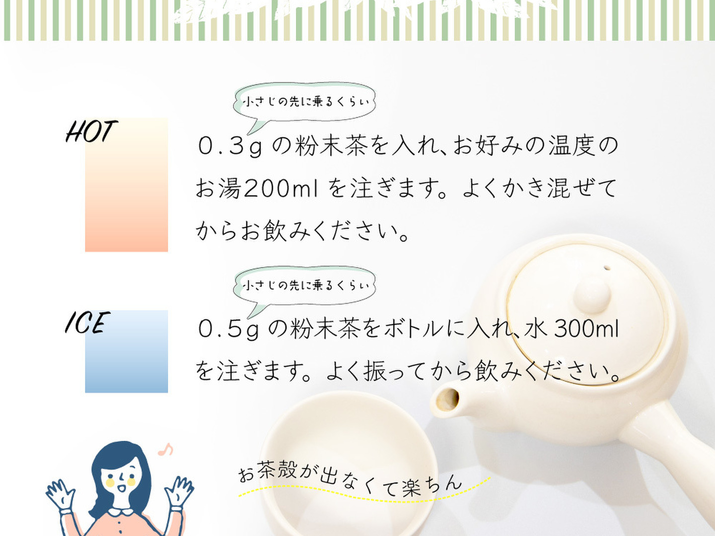 粉末茶なので水やお湯にさっと溶け、茶殻が出なく淹れるのが簡単。