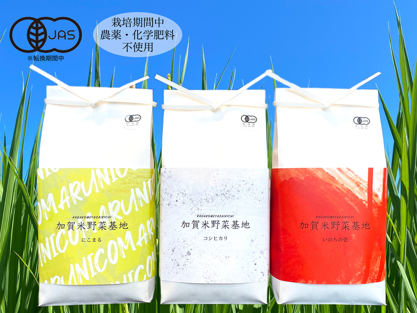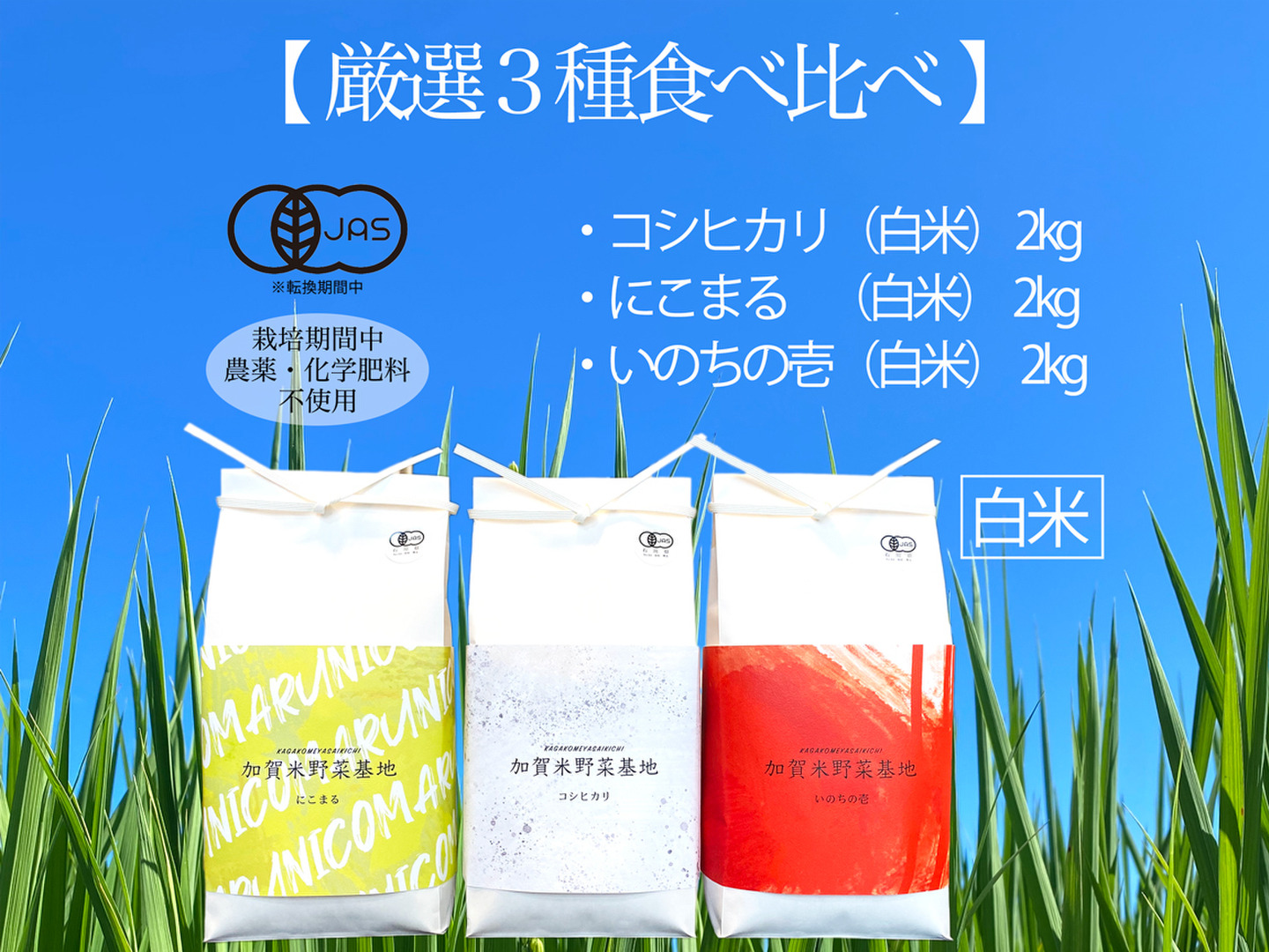 【令和6年産 新米】☆お米番付2022優秀賞受賞農家☆農薬・化学肥料不使用「厳選3種食べ比べセット」白米3種各2㎏(にこまる・いのちの壱・コシヒカリ)<有機JAS>『加賀米野菜基地』