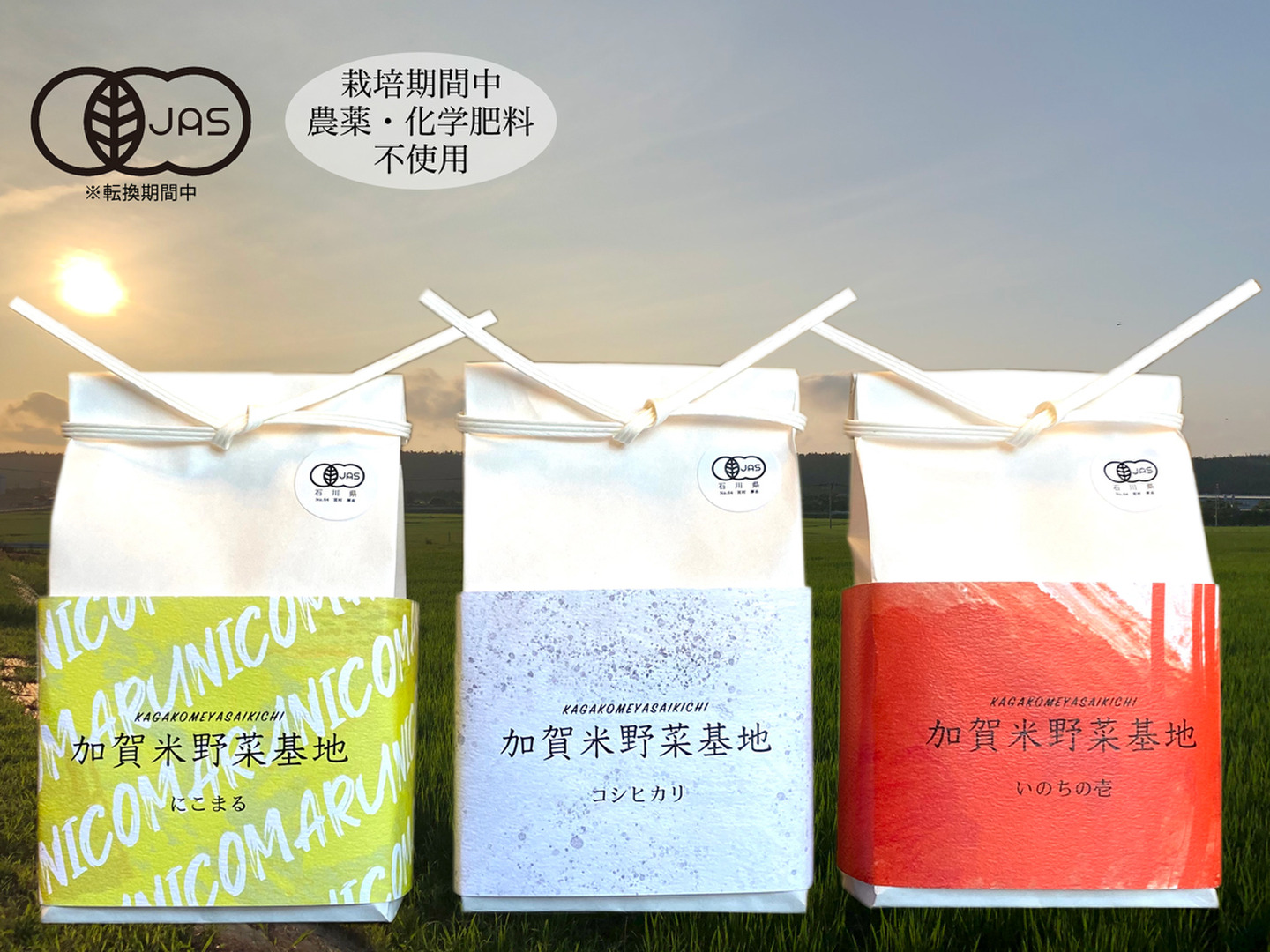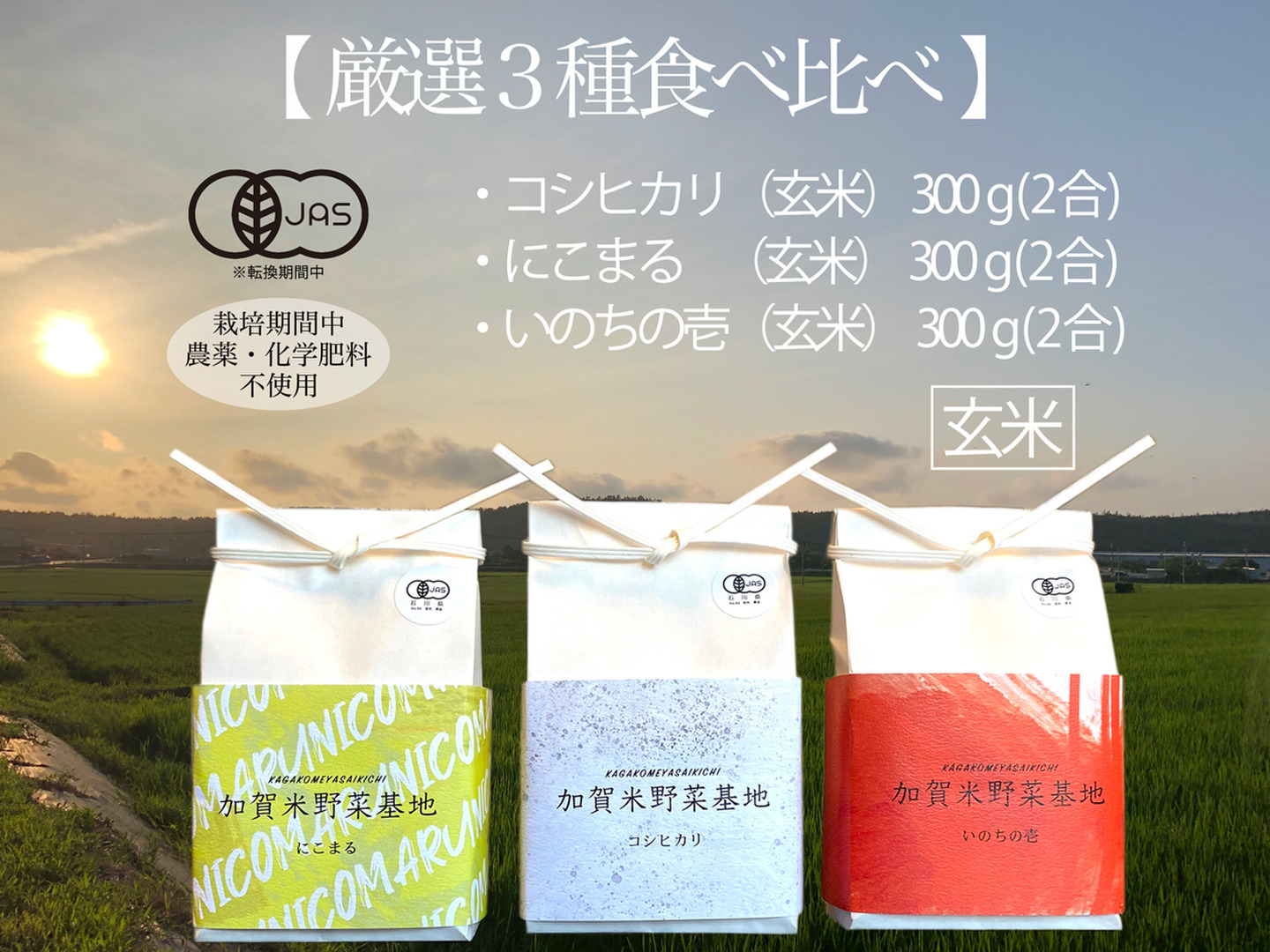 【新米】☆お米番付2022優秀賞受賞農家☆農薬・化学肥料不使用「厳選3種食べ比べセット」玄米3種各300g(にこまる・いのちの壱・コシヒカリ)<有機JAS>『加賀米野菜基地』