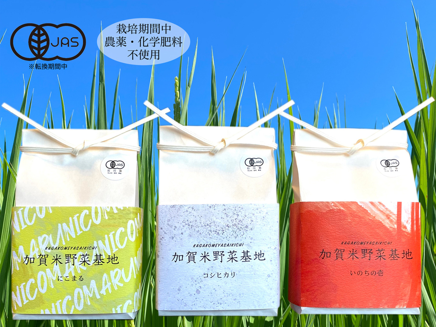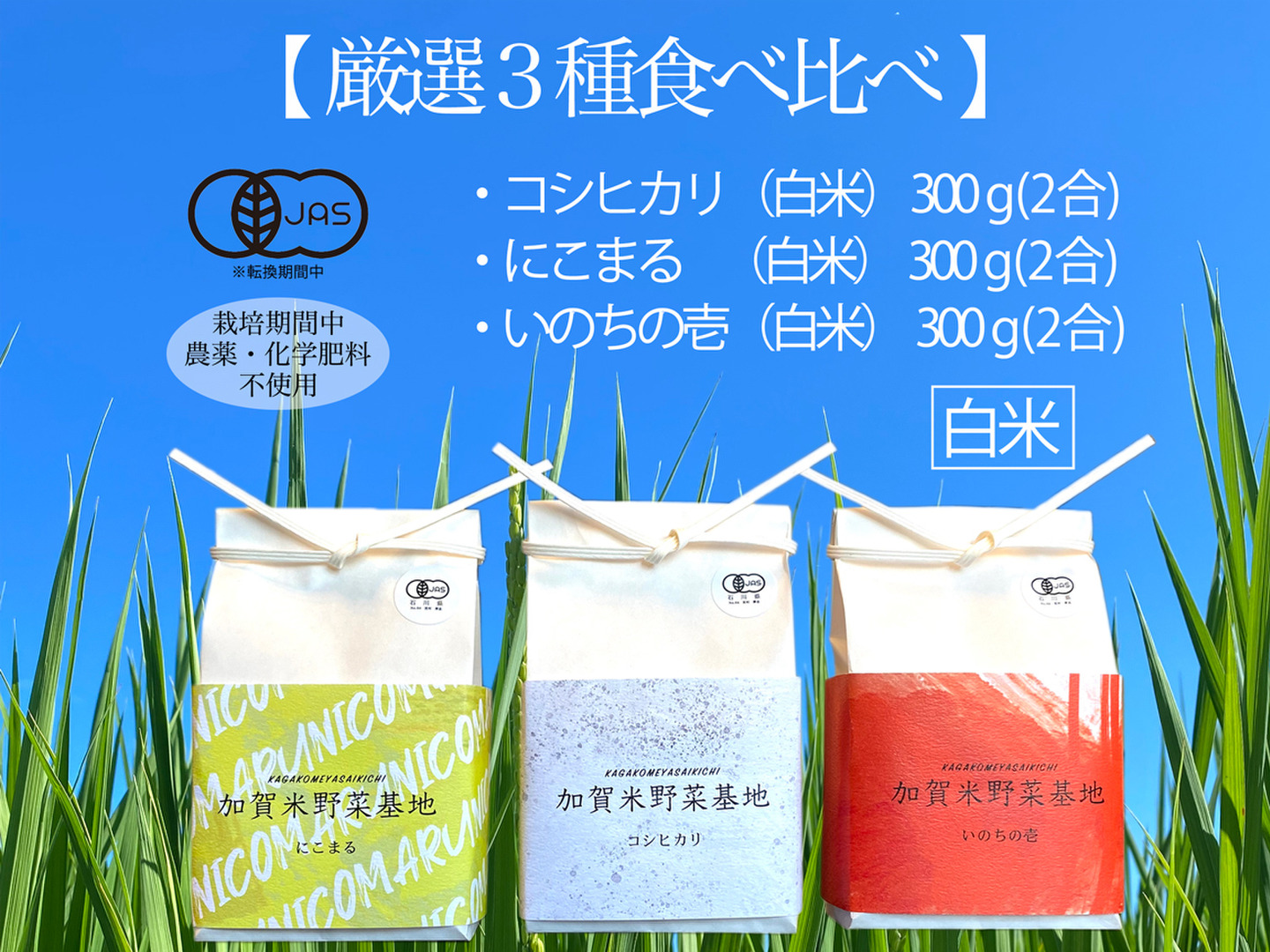 【新米】☆お米番付2022優秀賞受賞農家☆農薬・化学肥料不使用「厳選3種食べ比べセット」白米3種各300g(にこまる・いのちの壱・コシヒカリ)<有機JAS>『加賀米野菜基地』