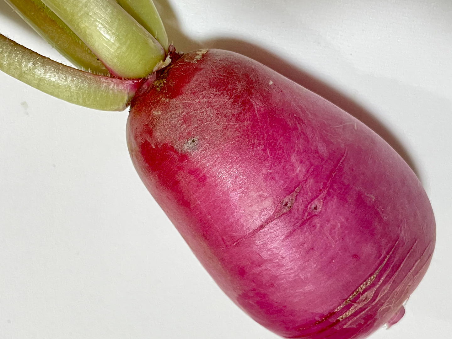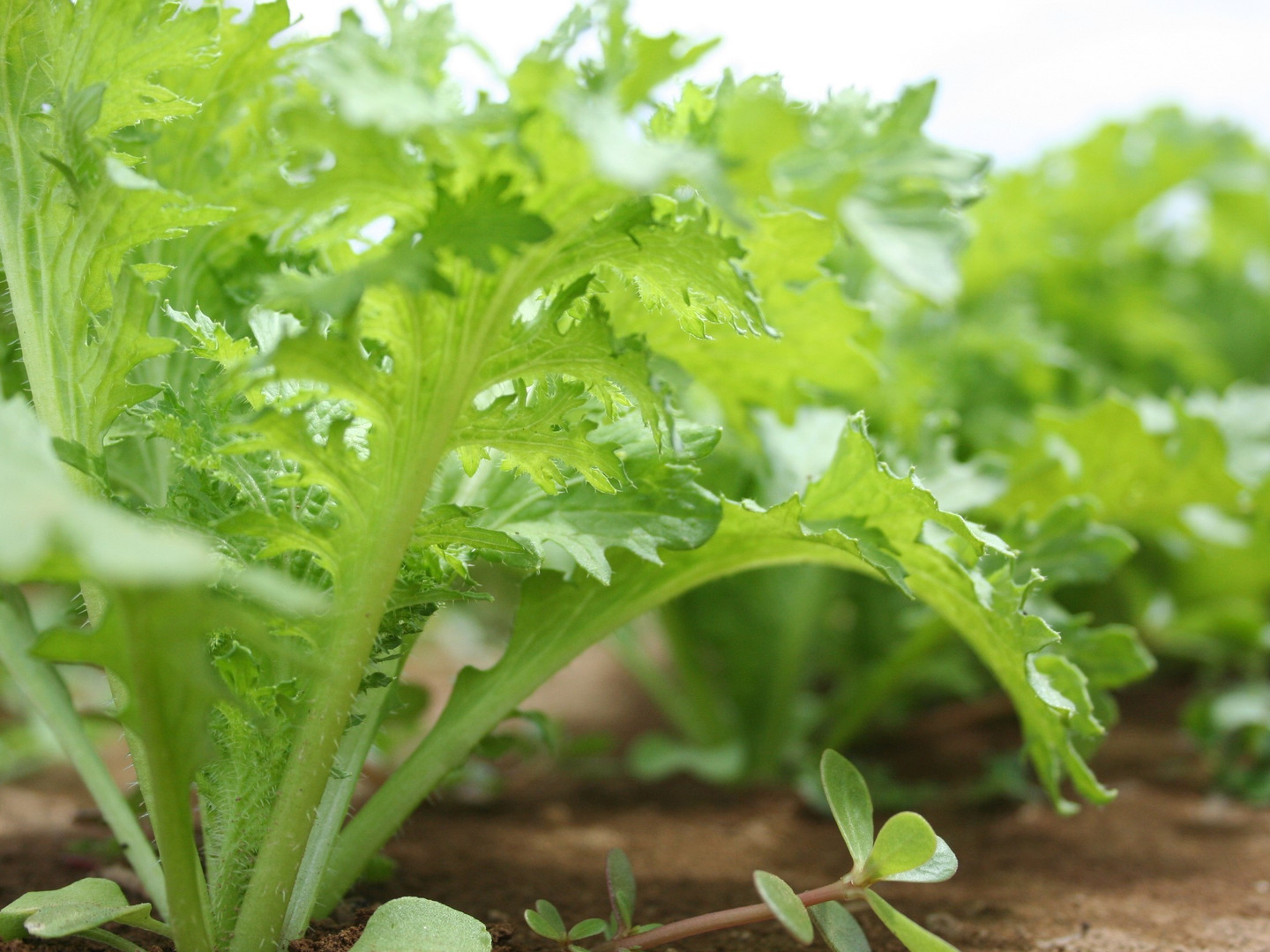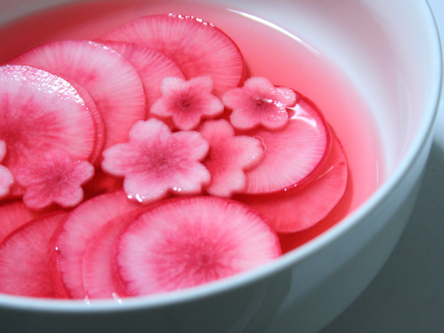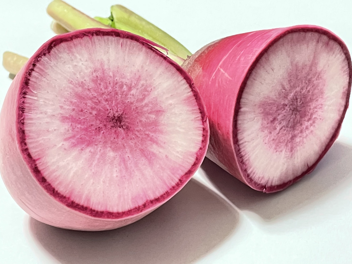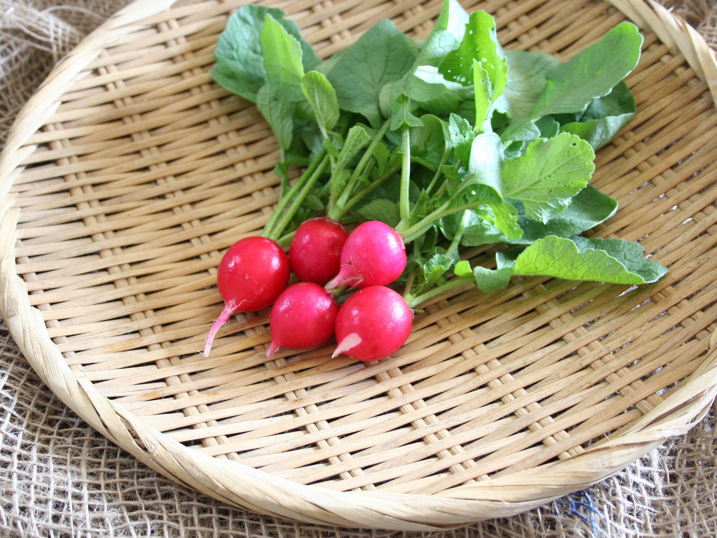 桃色のかわいらしい大根『京ざくら大根』と香りのよい赤サラダからし菜、シャキシャキのわさび菜、小っちゃくてかわいいラディッシュ、この時期限定のミニ人参を組み合わせました。