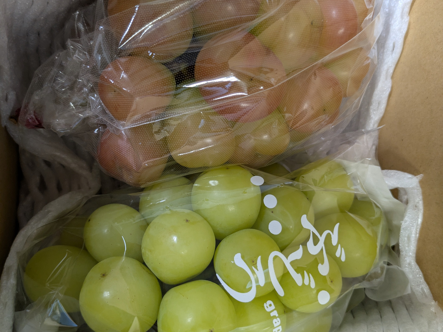 当園で栽培した「マイハート」及び「シャインマスカット」です。甘く美味しいブドウです。