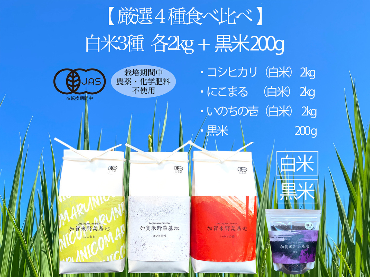 【新米】☆お米番付2022優秀賞受賞農家☆農薬・化学肥料不使用「厳選4種食べ比べセット」白米3種各2㎏(にこまる・いのちの壱・コシヒカリ)+黒米200g<有機JAS>『加賀米野菜基地』