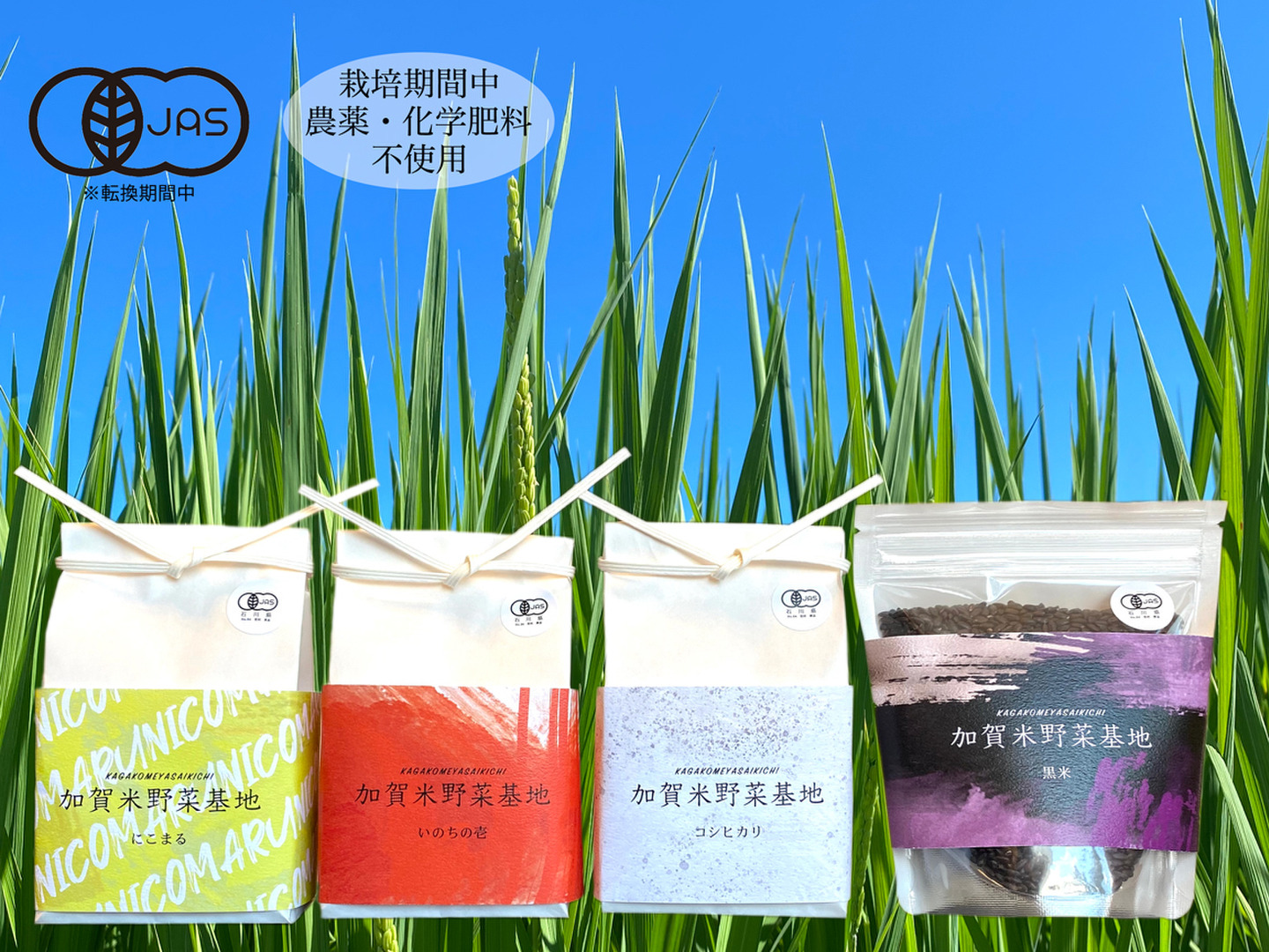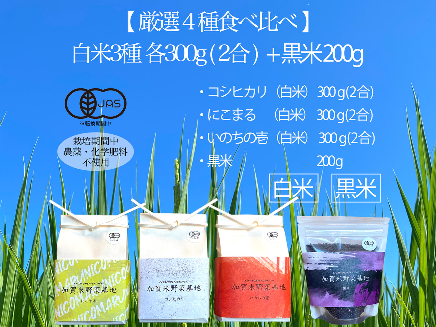 【新米】☆お米番付2022優秀賞受賞農家☆農薬・化学肥料不使用「厳選4種食べ比べ」白米3種各300g(にこまる・いのちの壱・コシヒカリ)+黒米200g<有機JAS>『加賀米野菜基地』