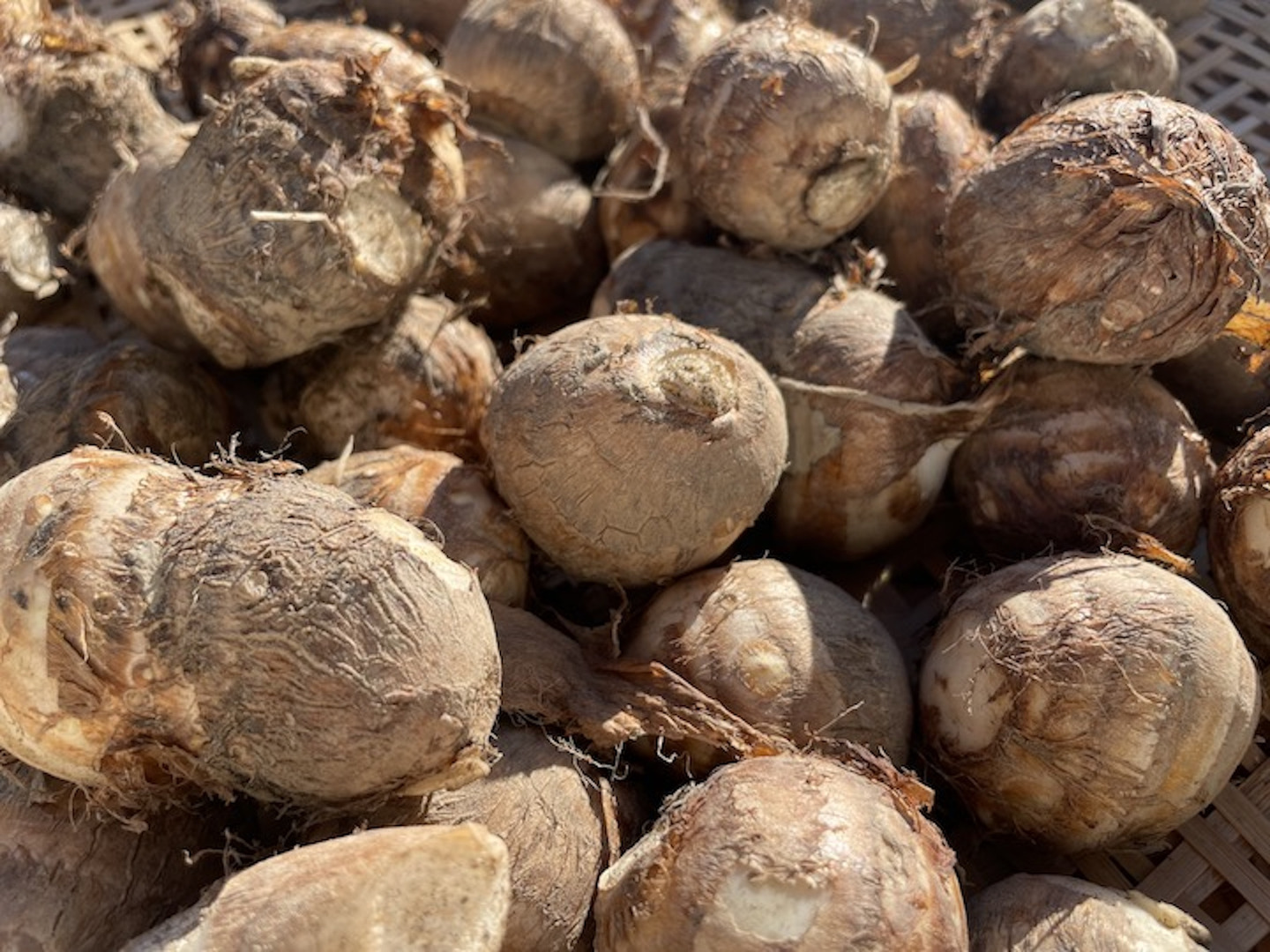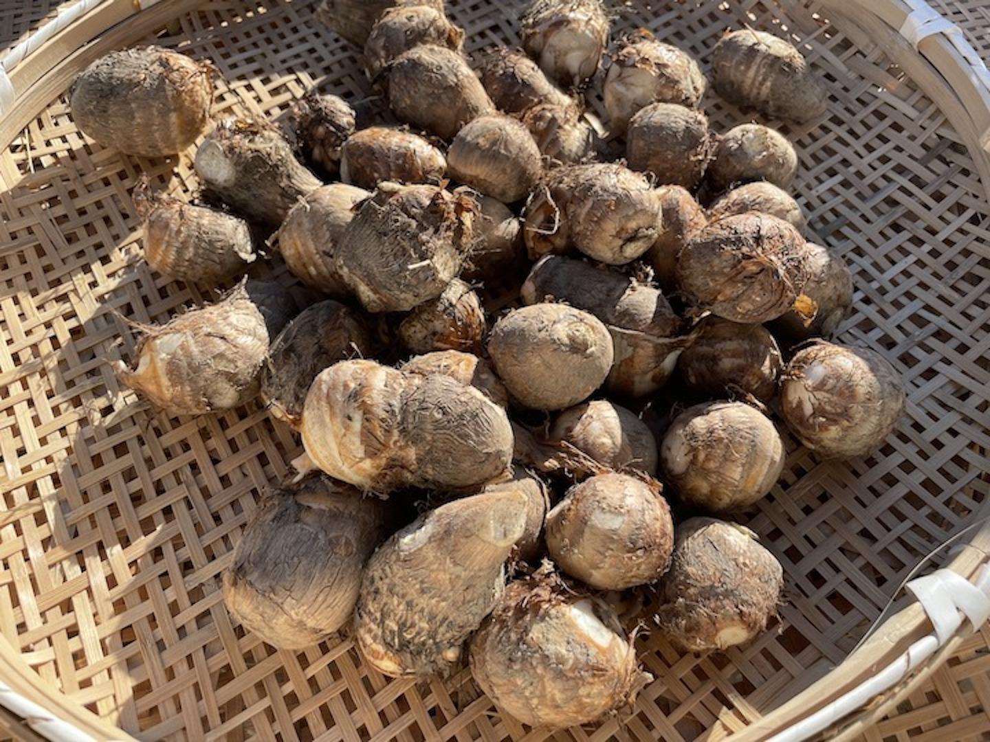 一般的なさといもに比べて形が丸く、肉質の軟らかさ、粘り気の強さが特徴です。