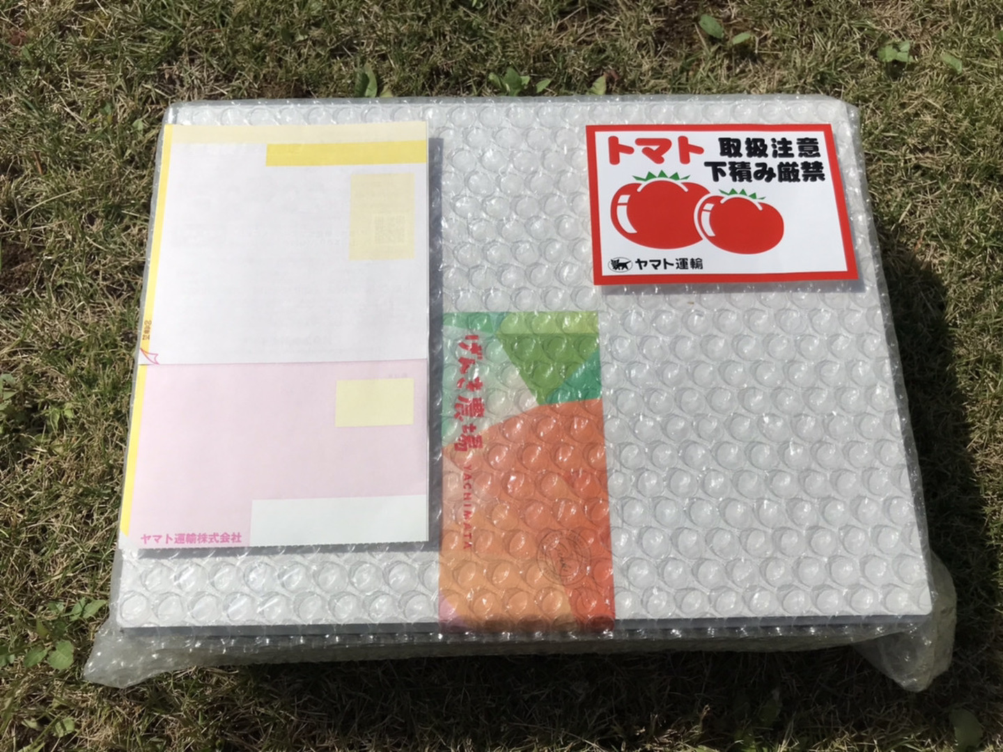 白い箱に色とりどりのトマトをイメージして作ったげんき農場のシールがついています✨