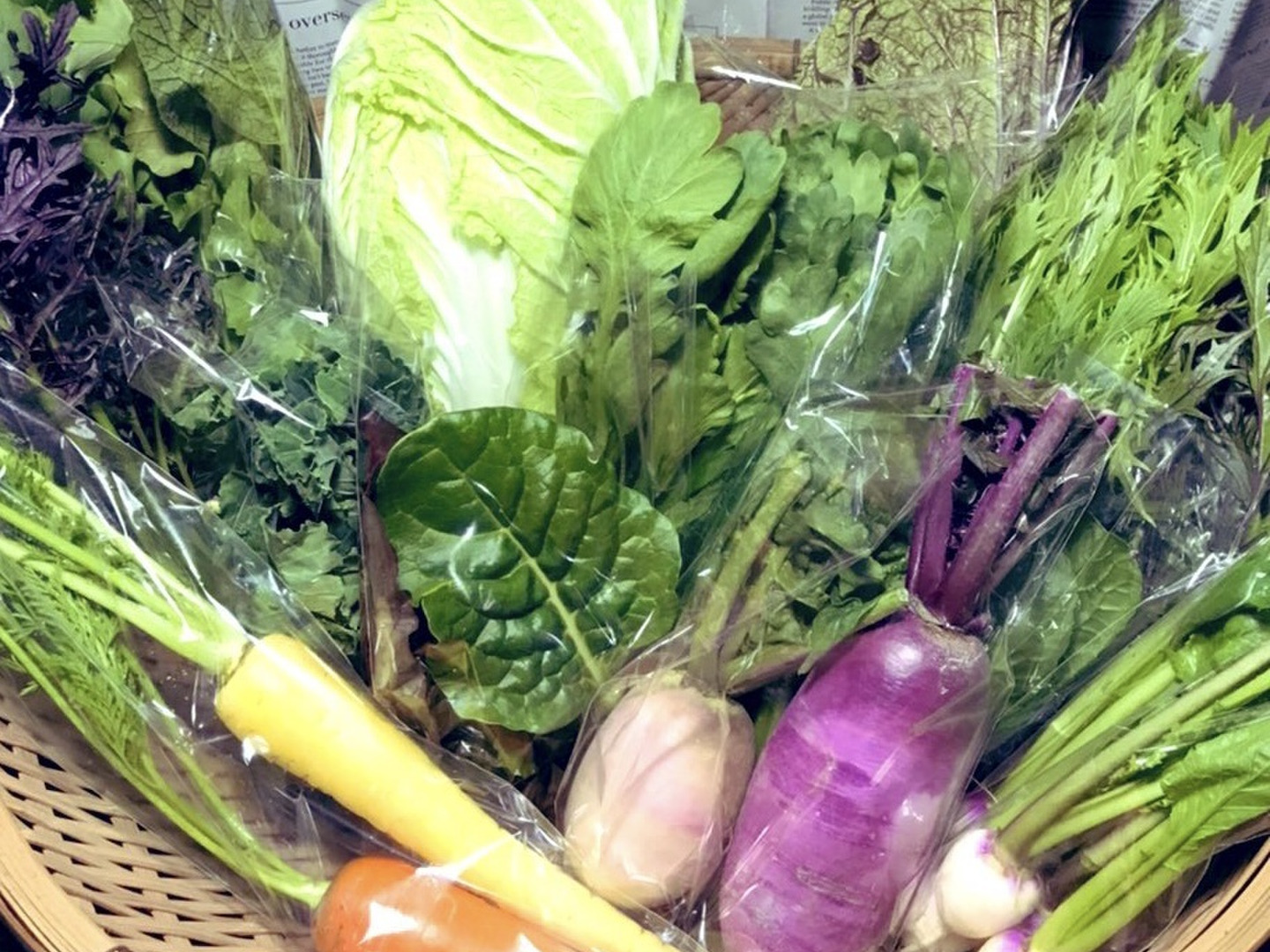 白菜、小松菜、ちぢみ小松菜、ほうれん草、ちぢみほうれん草、春菊、スイスチャード、サラダ水菜、紅水菜、レッドリアスからし菜、ルッコラ、大根、紅芯大根、京むらさき大根、紅くるり大根、聖護院大根、こたろう大根、聖護院かぶ、ミニかぶ(葉付き)、スティックにんじん、などなど