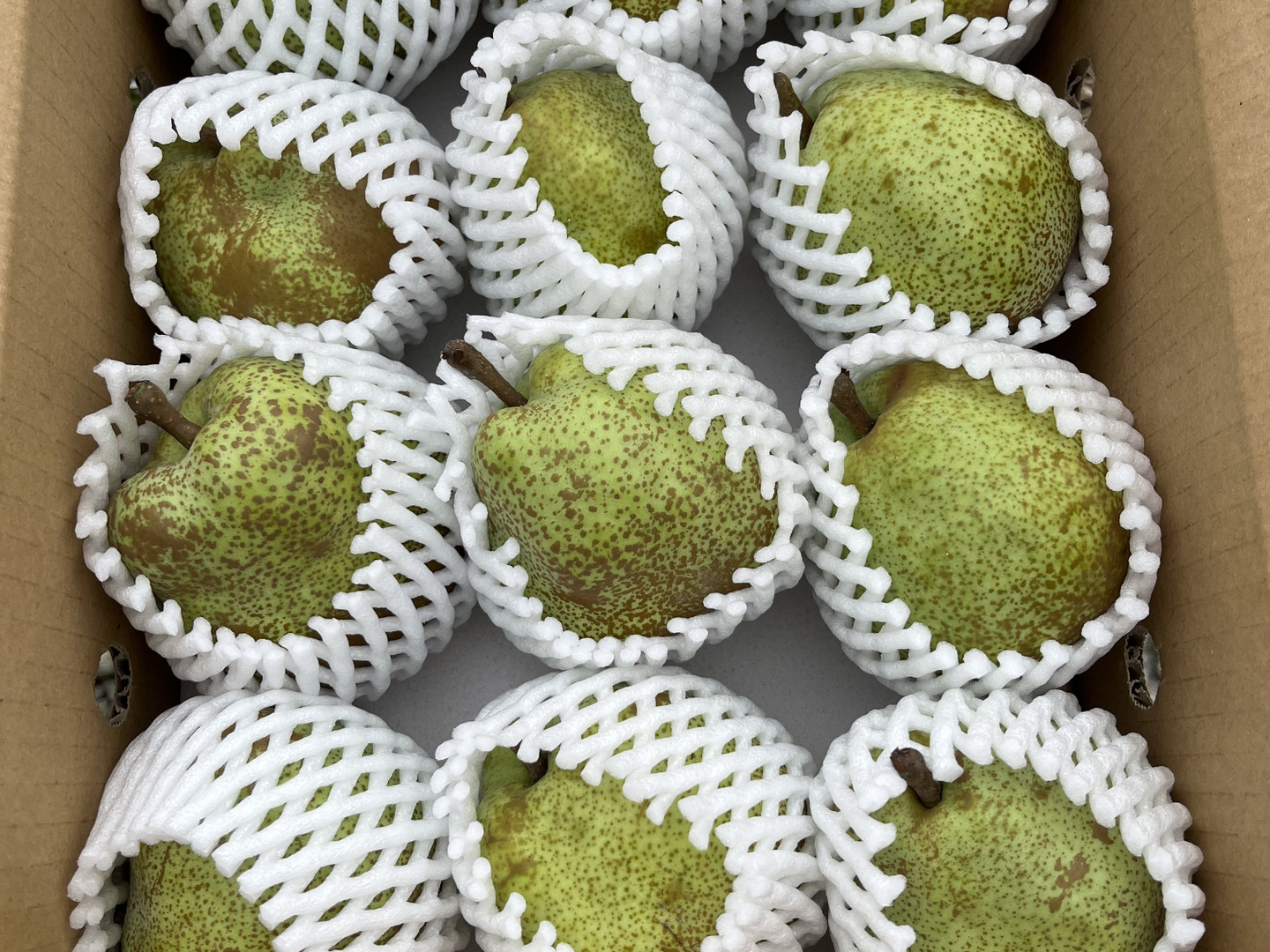 ラ・フランスは追熟しても果皮の変化があまりありませんが、うっとりするような香りがしてきます。軸まわりにシワが寄ってきて、指の腹で押すと沈むようであれば食べ頃が始まっています。