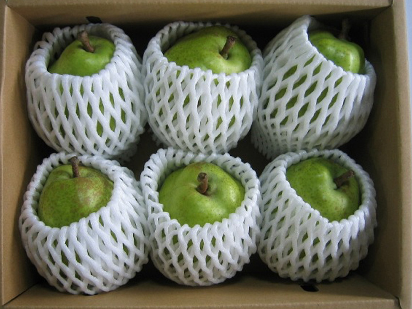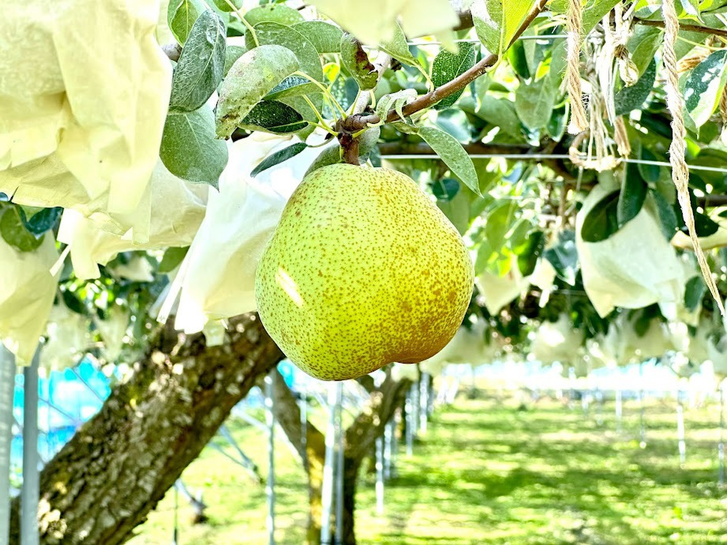 八ヶ岳南麓エリアの標高約800メートルの畑で、太陽の光が均一にたっぷりと当たるよう平棚栽培で育てました。果実に袋をかけ病害虫から守り、安心・安全・高品質にもこだわって生産しています。
