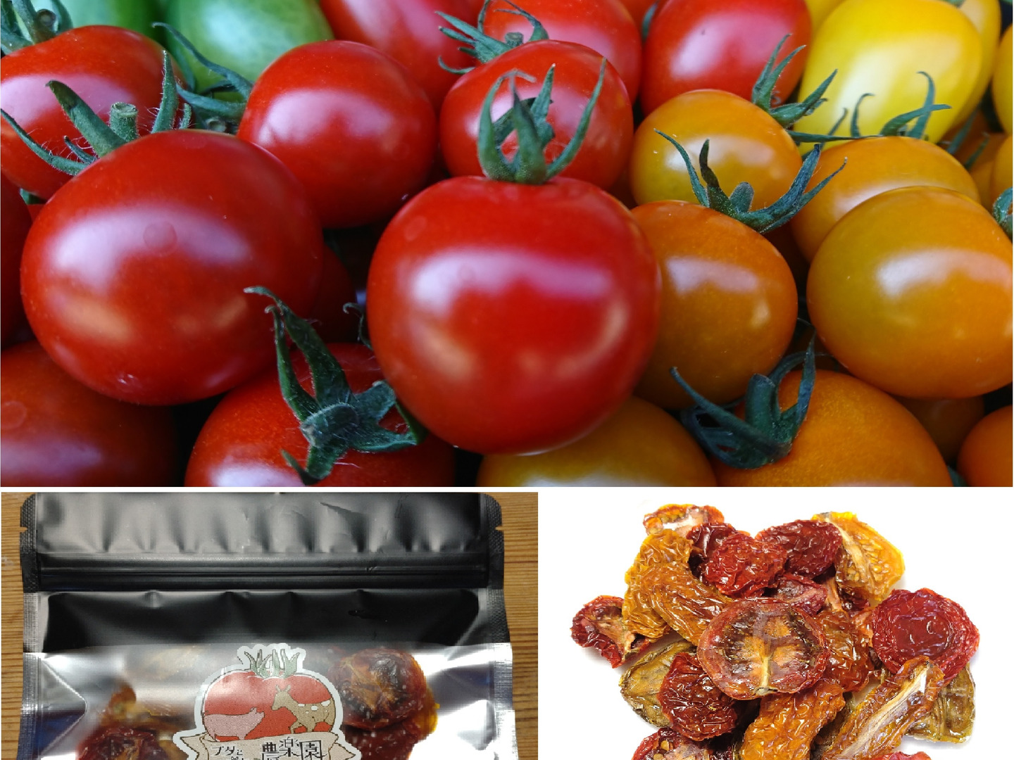 カラフルなミニトマト&ミディトマトの詰め合わせ(1kg)と、トマト農家自家製のドライトマト(25g)のセット商品です。