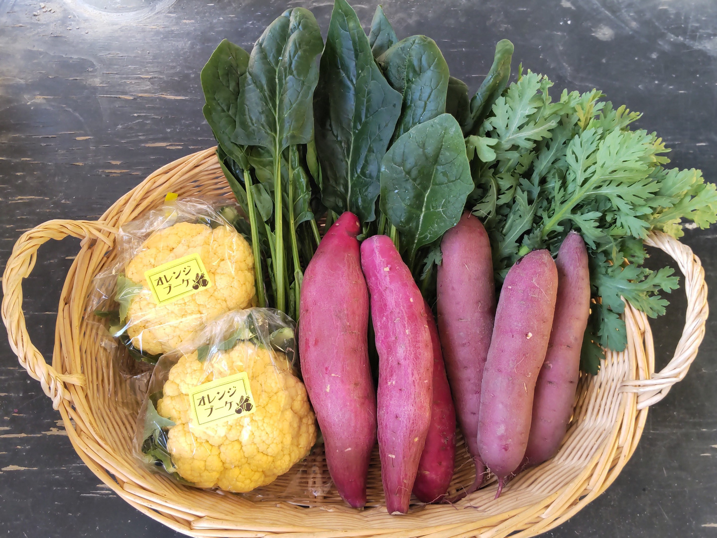 徳島名産の「鳴門金時」と食べ比べ「紅はるか」のセット、珍しい「オレンジブーケ(カリフラワー)」、今が旬の「ほうれん草」、「菊菜」を詰め合わせた、野菜セットです。