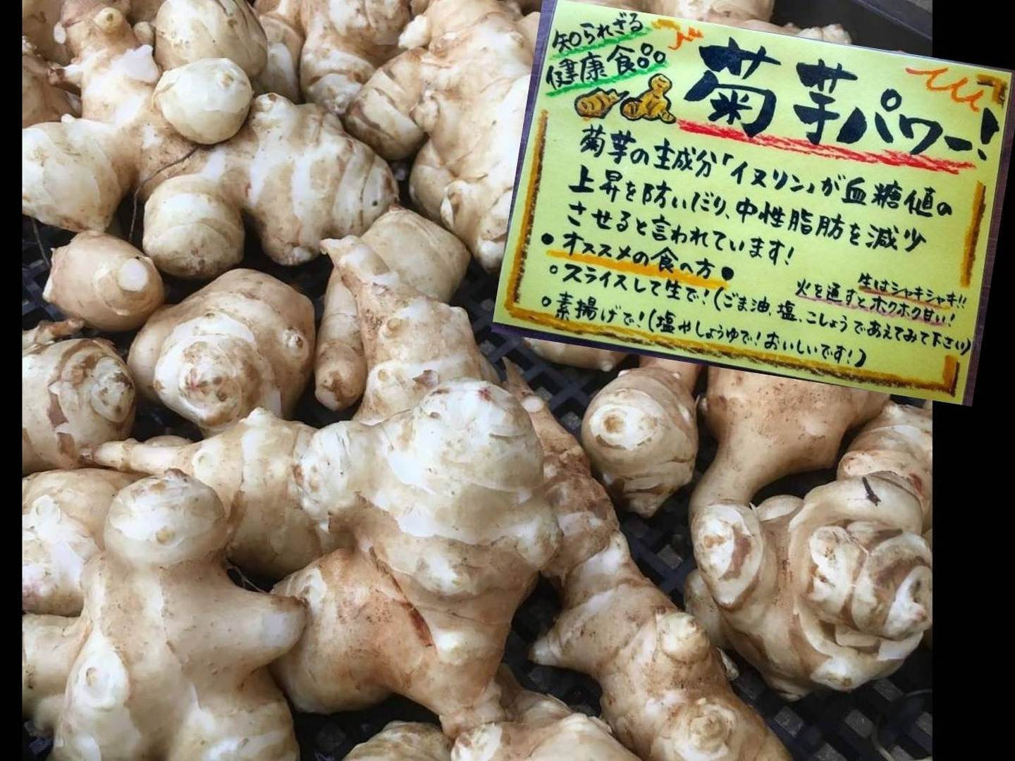 菊芋にはイヌリンが多く含まれ、血糖値を下げる効果があると言われています。また腸内環境を整えたり免疫力アップなど様々な効果が期待されています。