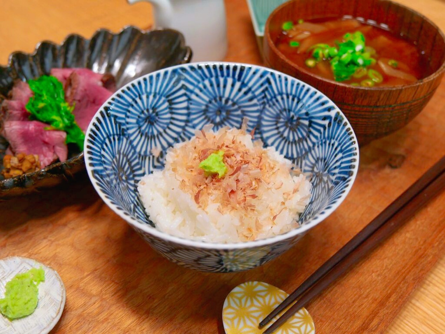 ご飯の上にかつお節、そこに本生わさびをおろしてのせて、お醤油をかけるだけ。