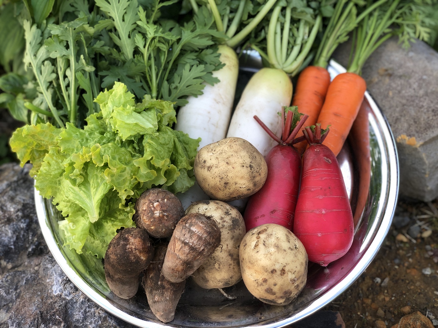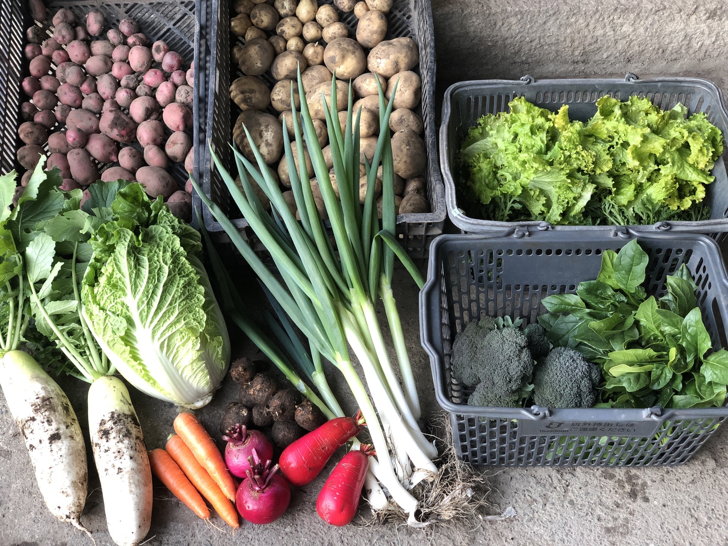 園主の判断で、採れたて野菜を100サイズの箱に詰めてお届けします。写真にあるような野菜を中心に発送します。その日の収穫により変更があることと、鮮度を保って発送したいので、出来るだけ水洗いなどせずに発送しますので、ご理解の上、お求めいただければ幸いです。現在収穫できている里芋・おでん大根・赤大根・かぶ・白菜・春菊・ニンジン・リーフレタス・ほうれん草・じゃがいも・サツマイモ、ネギなどから7〜10品発送いたします。