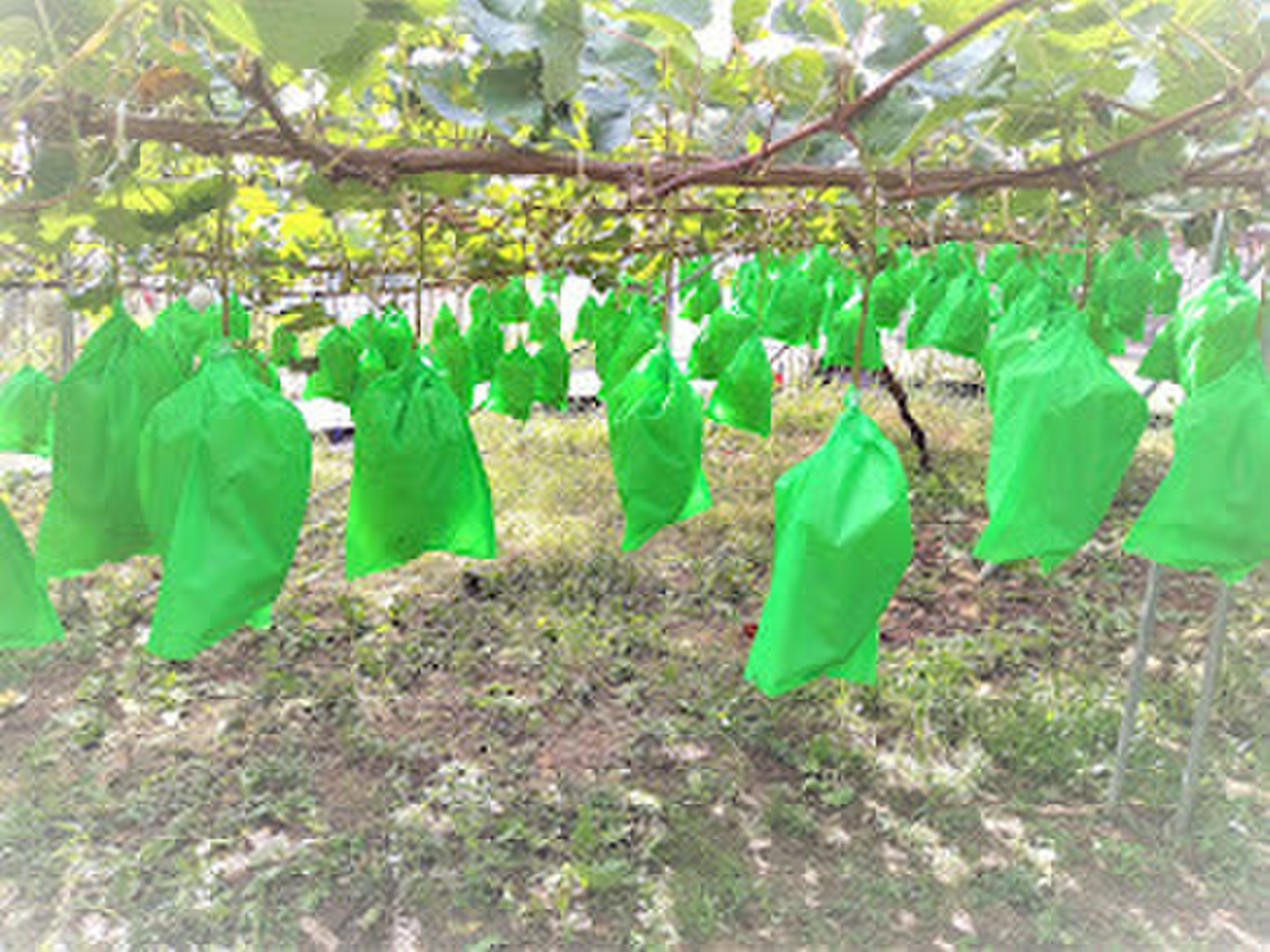 ハウスの中でぶどうの木にぶら下がり、