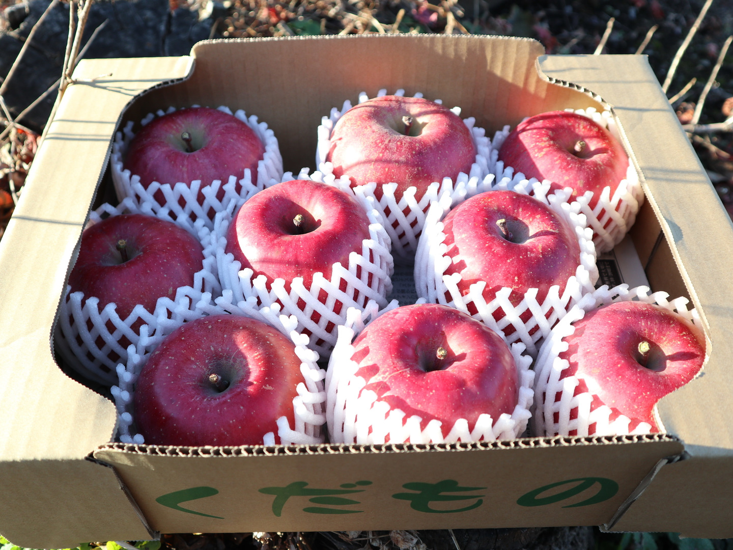 私たちは、りんご栽培に適した環境の中で、1年に1度の収穫に向けて、冬からの剪定、繰り返し行う摘果、実全体に色がつくように一つ一つ玉を回すことなど手間を惜しまず育てています。お日様の力を十分もらって育ったサンふじを信州松本からお届けします。