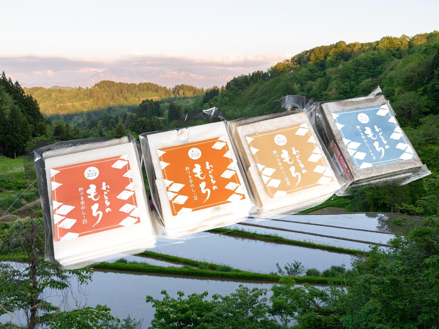 【伝統的な製法】水を使わず搗きあげた「わかとち産もち」セット(白餅500g×1/よもぎ餅500g×1/豆餅500g×1/玄米餅500×1)