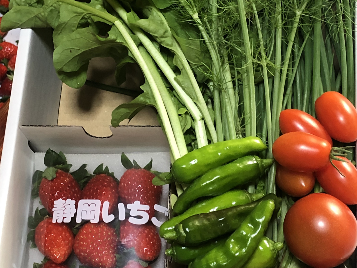 イチゴ2パック(あきひめ、紅ほっぺ混合)と各種野菜のセットです。イチゴの4パックの箱にイチゴ2パックと各種野菜を詰め合わせてお届けします