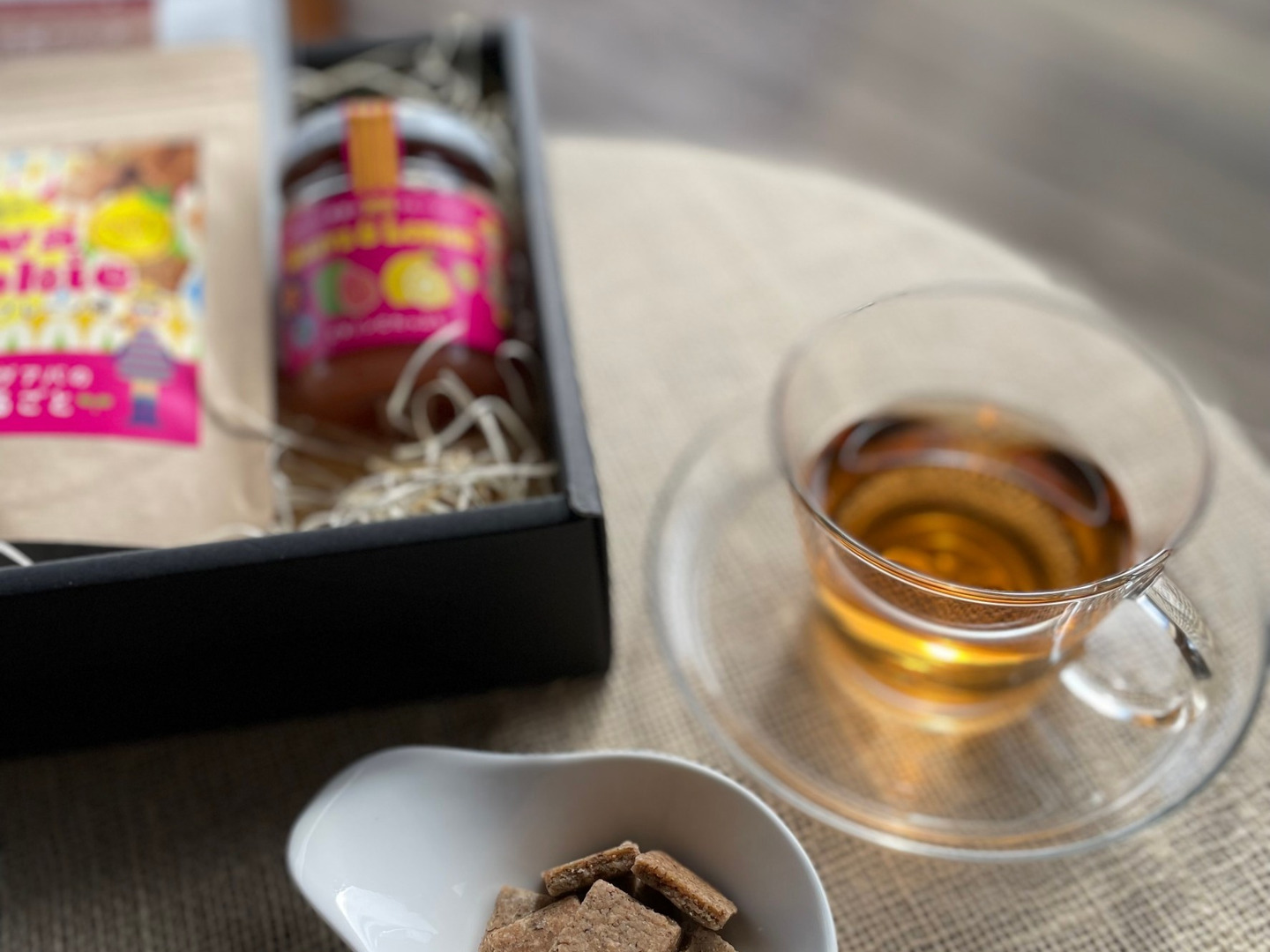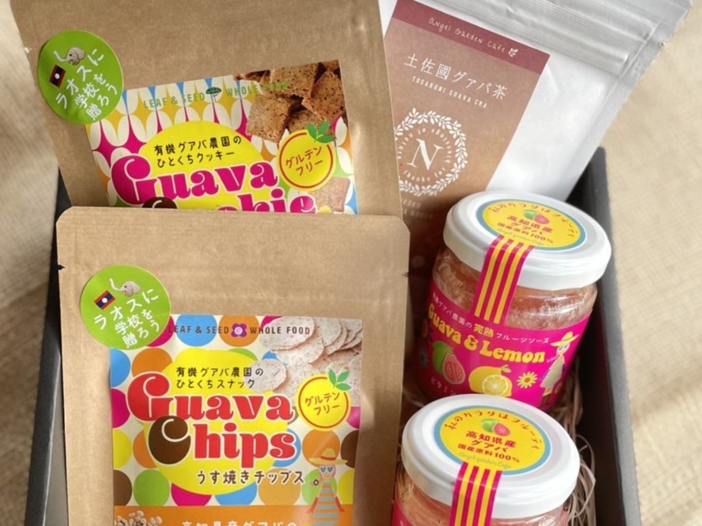 グルテンフリーのクッキーとチップス、グアバ茶、グアバとレモンのフルーツソースが入った有機グアバ農園こだわりのギフトセットです。