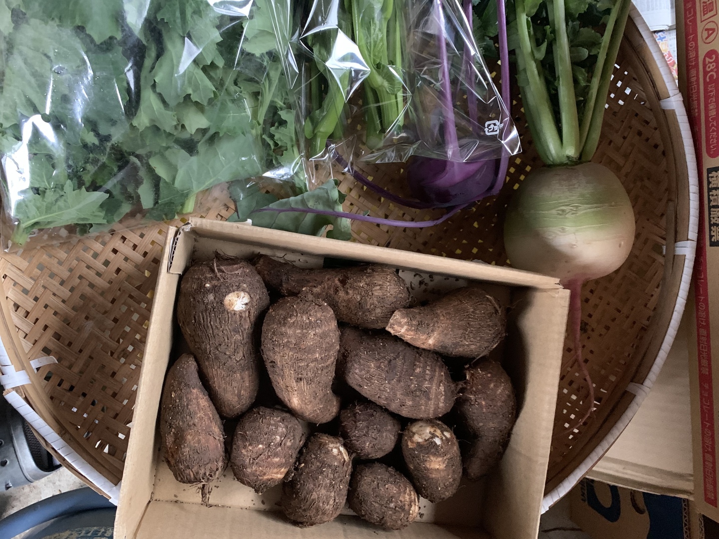 紅心大根、子カブ、サラダにんじん、里芋、ケール、キンカン、柚子、レモンなどを詰め合わせて発送します。