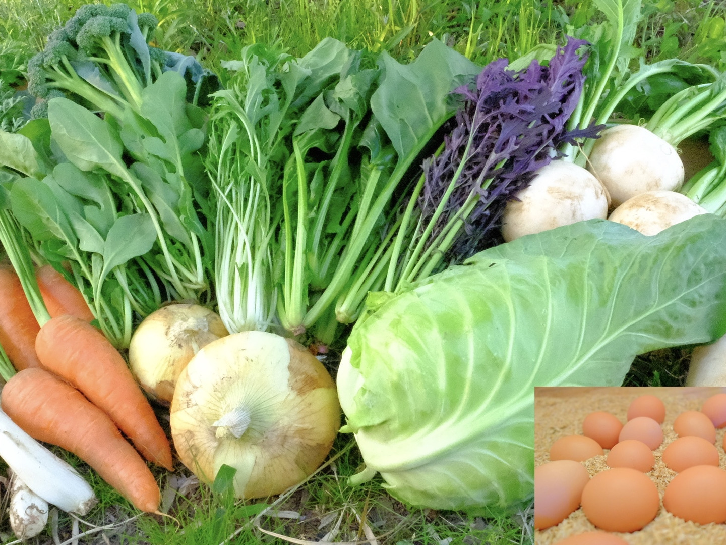 季節の野菜セット小(1人〜2人用)8〜10種類のお野菜と平飼い有精卵6個です。