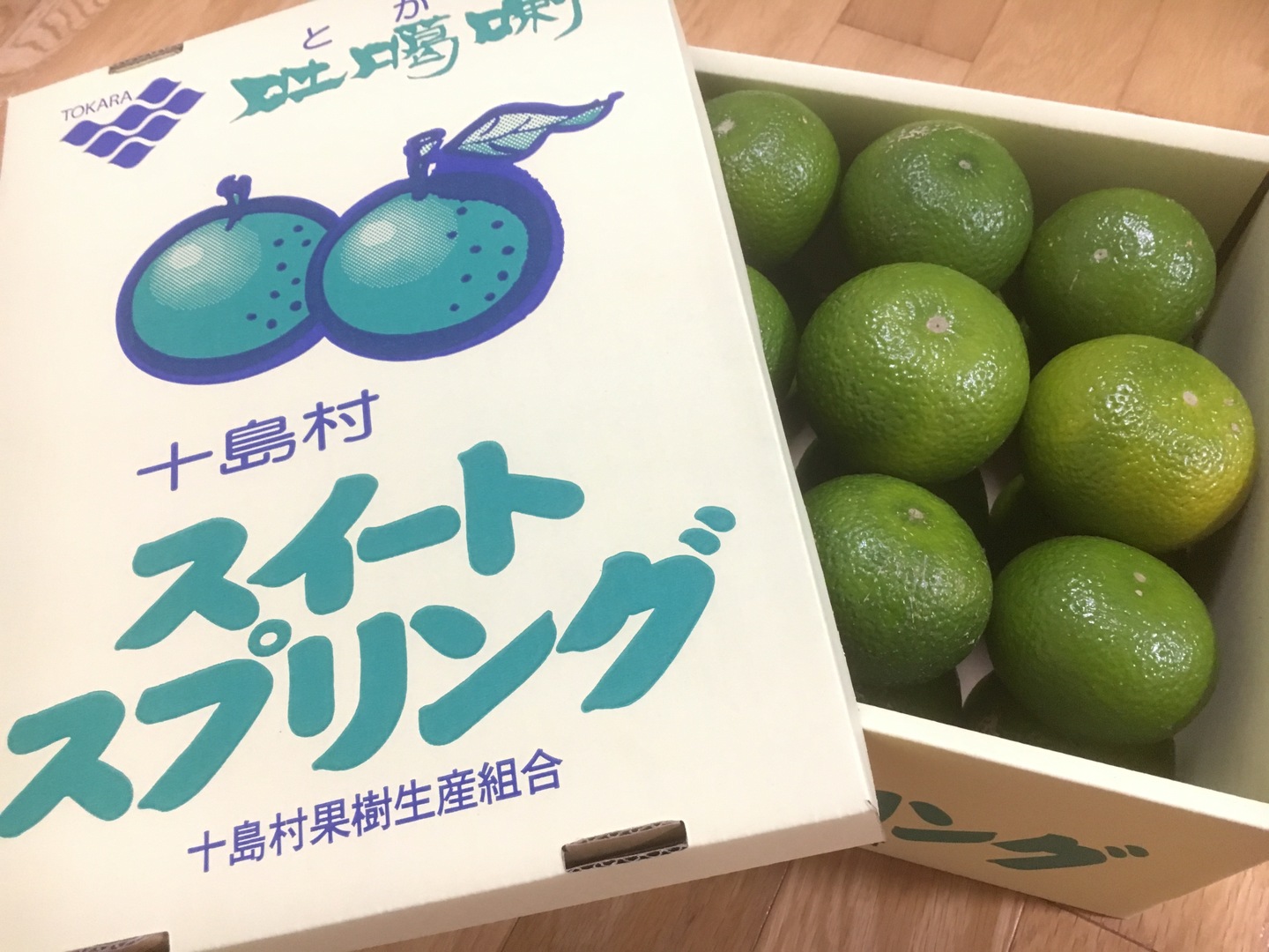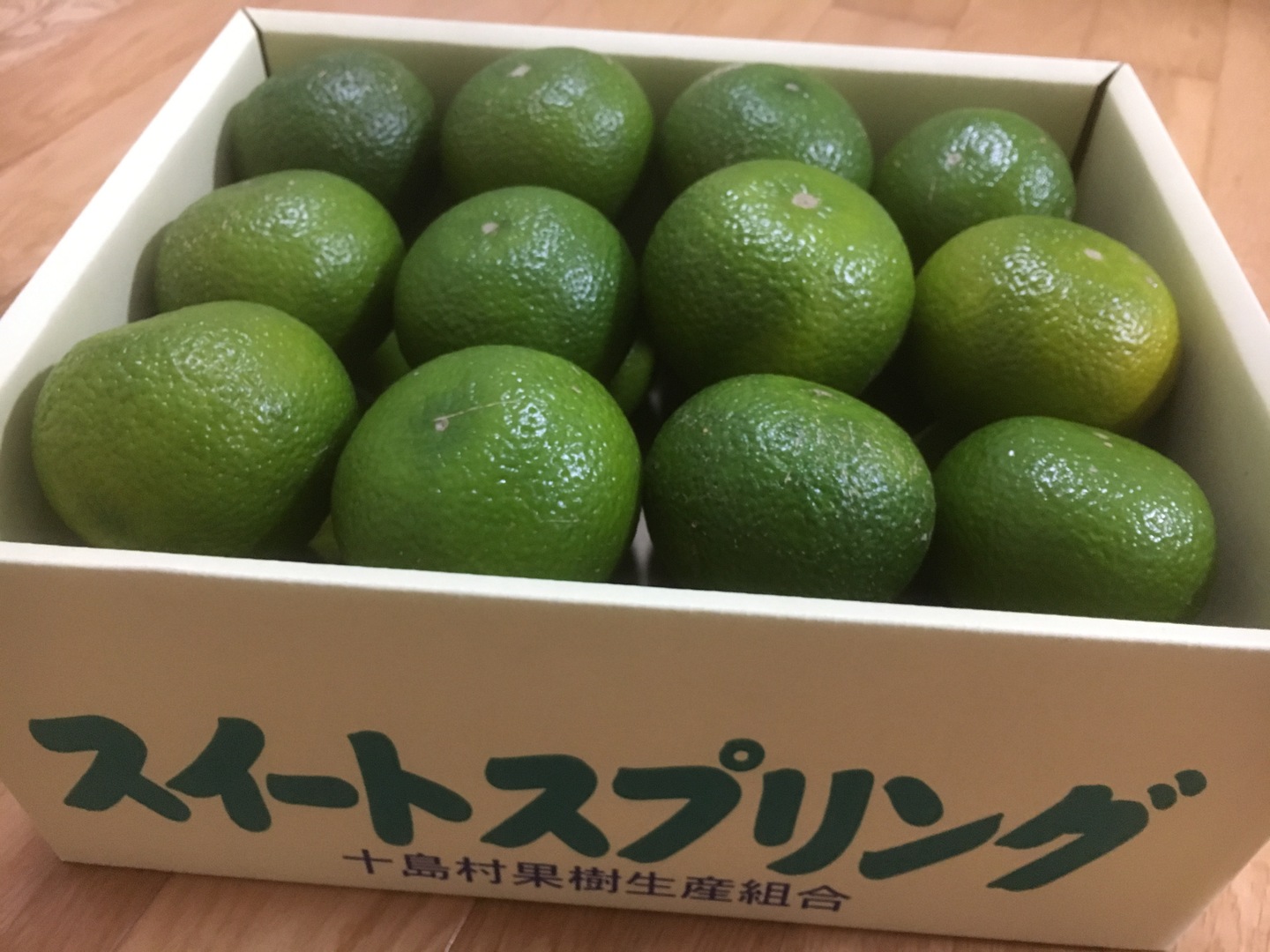 トカラ列島 中之島の太陽と黒潮の潮風をめいっぱい受けて育ったスイートスプリングです。スイートスプリングは上田温州と八朔の交配種で見かけは緑色で酸っぱそうに見えますが、とってもジューシーで甘く爽やかな酸味とのバランスが絶妙です!追熟すると黄色くなり甘さが増しますので、お好みのタイミングで御賞味ください。プリプリ肉厚の果肉に包まれたたっぷりの果汁は酸味と甘みのバランスが良く、さっぱりとした口当たりで搾ってジュースにするのもおススメです。また、贈答用にもとっても人気です。【6kg で約20〜24個程度】