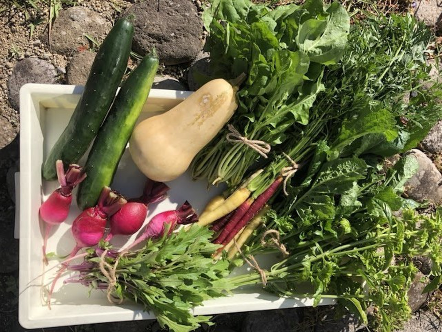 普段使いの野菜に少し珍しい野菜を加えています。色合いなど、ワクワク感もあわせてお届けします。ニンジン、ビーツ、かぼちゃ、ルッコラ、じゃがいも、フェンネル、パセリ、わさびリーフ、壬生菜、水菜、かぶ、葉レタス、ラディッシュ、キャベツの中から最適な野菜を詰め合わせます。