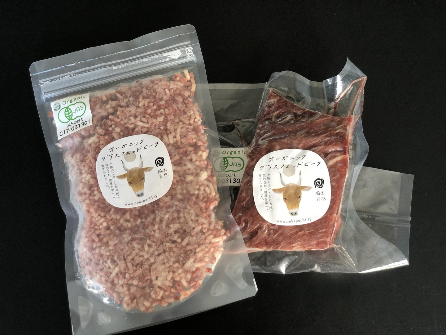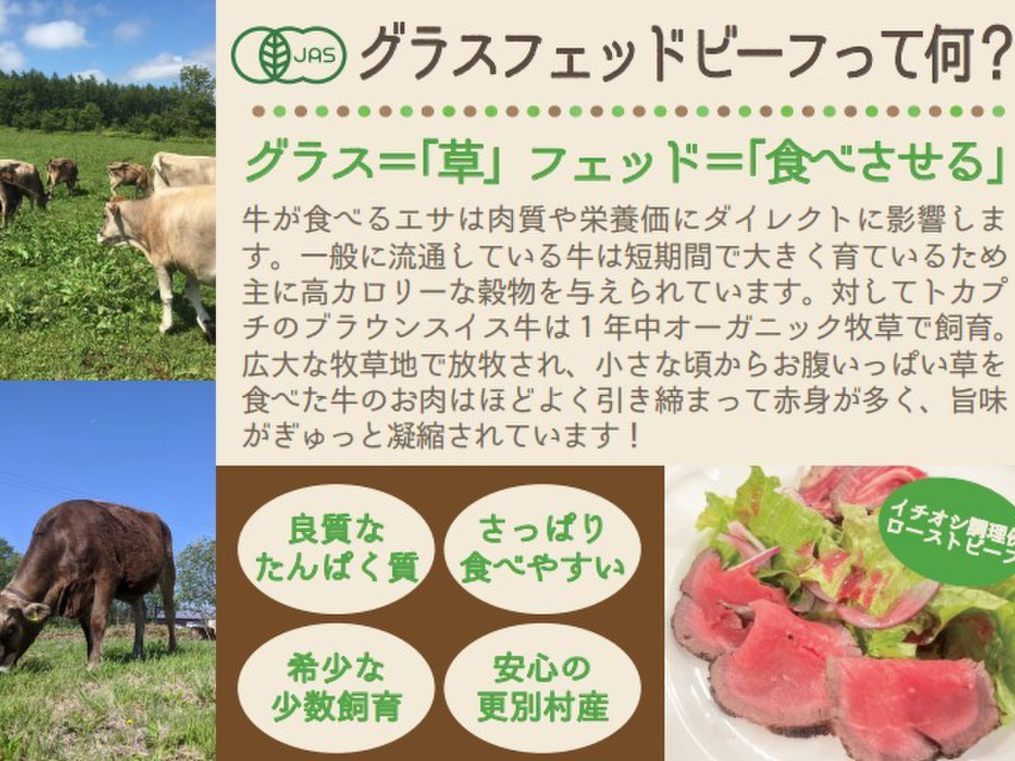 商品について あわせ買い対象 同生産者の別の「あわせ買い対象」商品と一緒にご注文いただくと、送料をまとめてお届けできる場合があります。 生産者からのお知らせ 【配送について】ご注文いただいた翌週金曜日に発送させていただきます。出来るだけ新鮮な商品をお届けするためご了承くださいませ。【定休日のお知らせ】土曜、日曜、祝日が定休日となっております。この間はお問い合わせなどいただいてもお答えできません。ご了承くださいませ。 もっと見る 内容 オーガニックグラスフェッドビーフ ひき肉 250g、オーガニックグラスフェッドビーフ ブロック肉 300g 各1個 発送 ヤマト運輸 送料 ¥ クール便(冷凍) + ¥ 660 複数注文すると送料がまとまります。 種別 肉 牛肉 その他牛肉 産地 北海道 平飼い・放牧 肉 有機JAS その他牛肉 北海道x肉 北海道x牛肉 北海道xその他牛肉 商品説明 ●グラスフェッドビーフができるまでグラスフェッドビーフという言葉を聞いたことがありますか?グラス=草、フェッド=食べさせる、で、その名の通り、草を食べて育った牛のお肉です。対して、一般的に流通しているお肉は主に穀物を食べて育てられています。バイオダイナミックファームトカプチは、アニマルウェルフェア(動物福祉)を重視し、牛の健康と幸せを第一に考えて飼育しています。雪の降らない時期は、ほぼ24時間の完全放牧。夏はひろびろと広がる土づくりからこだわった放牧地で青草を、冬は農場で生産したオーガニック牧草を中心に、国産オーガニック飼料を食べ、ストレスなく健やかに過ごしています。牛の健康や出荷時のお肉の状態を想定し、農場でとれた有機小麦のふすまや、有機大豆等を与えています。そんな環境で育った牛たちは、オメガ3脂肪酸、短鎖脂肪酸、共役リノール酸、亜鉛、鉄などが豊富で良質なたんぱく質となります。赤身主体のお肉で私たちの体にも優しいお肉です。原料、生産工程共に畜産の有機JASマークも取得しておりますので、安心してお召し上がりいただけます!安定供給が難しいこの特別なお肉を ぜひご賞味ください♪●どんな味?放牧でほどよく運動した牛のしっかりとした肉質で赤身が多く、上質な脂で胃もたれしません。牛本来のうまみがぎゅっと濃縮された、普段なかなか味わうことのできない美味しさです。今回は、和牛とブラウンスイスがかけ合わさった牛です。なので、写真のローストビーフのようにほどよくサシがはいり、より食べやすいお肉になっております。●保存方法など冷凍便でのお届けとなります。調理時は、冷凍庫から出してすぐにお使いいただけます。●おすすめの調理方法ーひき肉ーあらゆるひき肉料理に。ボロネーゼや煮込みハンバーグなどがおすすめ♪ーブロック肉ーパーティ用にローストビーフに。厚切りにして塩をふり、レアステーキに。 もっと見る この商品のことをお友達にもシェアしませんか ポスト シェア
