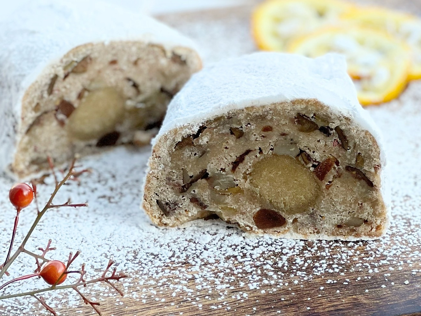 ダークラム等の洋酒に漬けたドライフルーツをふんだんに練り込んだ生地で中央の細長いマジパン(砂糖と挽いたアーモンドを練り合わせたお菓子)を包んで、発酵させて焼き上げ、それをキリストのお包みをイメージした真っ白な砂糖で包んだ、とても手の込んだクリスマス菓子です。