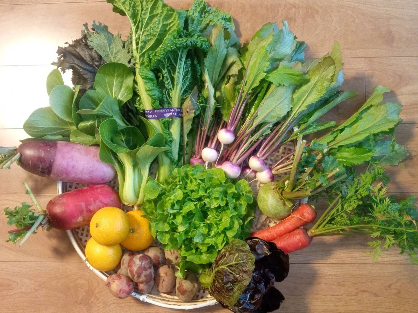 「里芋」「新ジャガイモ(アンデスレッド)」「キャベツ/サボイキャベツ」「チンゲン菜」「カブ(あやめ雪)」「イタリアレタス」「赤ダイコン各種」「ワサビ大根」「金時にんじん」「紫ケール」「トレビス(ほろ苦系イタリアレタス)」「かつお菜」等