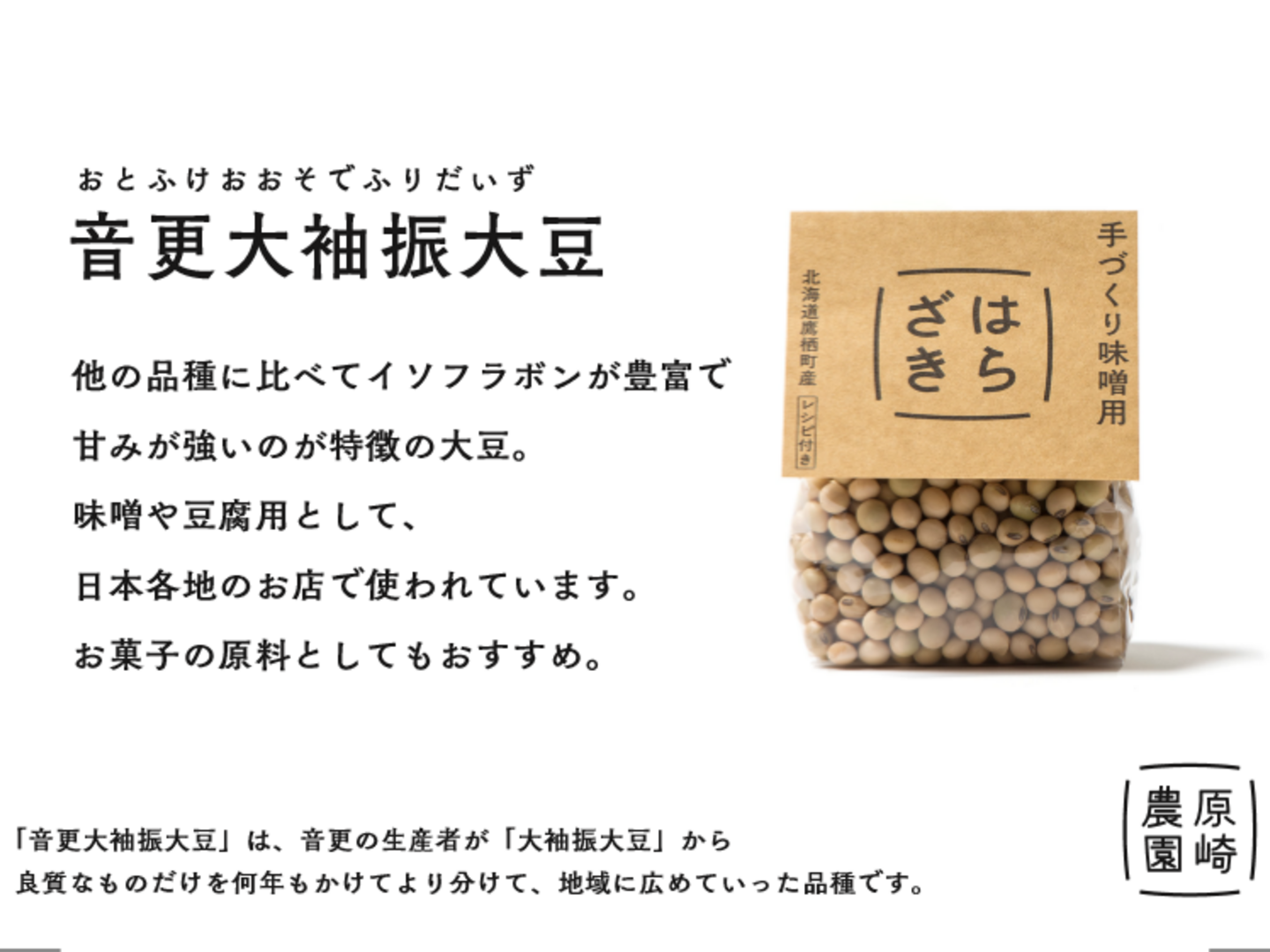 豆王国・北海道十勝の音更を中心に1950年ごろから栽培されている青大豆です。北海道で作付されていた「大袖振」と呼ばれる薄緑色の青大豆の中から、音更の農家が大粒で冷害に強いものを選別して栽培し、優良品種として普及した固定種です。