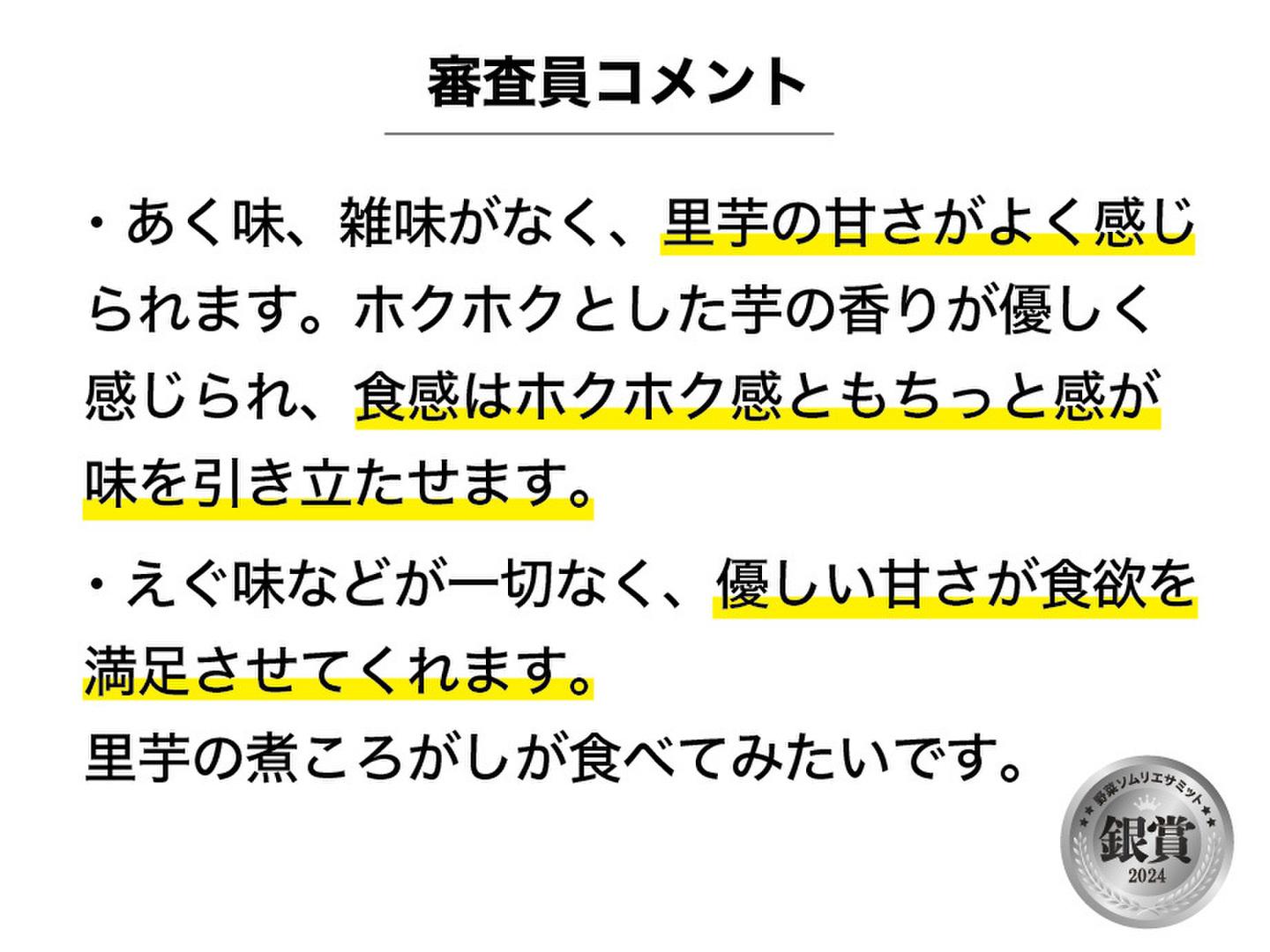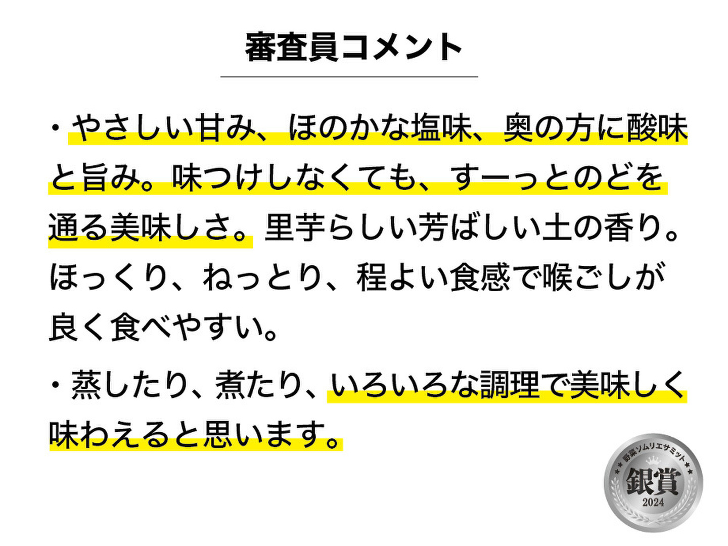 商品について あわせ買い対象 同生産者の別の「あわせ買い対象」商品と一緒にご注文いただくと、送料をまとめてお届けできる場合があります。 内容 里芋(セレベス)1.5kg 重量・容量 約1.5kg 発送 ヤマト運輸(食べチョク特別送料) 送料 ¥ 常温便 + ¥ 0 数量1点ごとに送料が発生します。 種別 野菜 里芋 セレベス 野菜 里芋 その他里芋 産地 静岡県 農薬化学肥料不使用 野菜 その他里芋 セレベス 静岡県x野菜 静岡県x里芋 静岡県xセレベス 静岡県xその他里芋 商品説明 ------●味の品評会「野菜ソムリエサミット」で『銀賞』を受賞!野菜ソムリエに「自信を持っておすすめする味」と認められました!(2024年2月)------静岡県西部 磐田原台地の温暖な気候と天竜川の伏流水に恵まれた地域です。農薬や化学肥料を使わず、有機肥料100%で土づくりにこだわって野菜を育てています。にじのわファームの「里芋」品種は「セレベス」で、ほっくりした美味しさです。里芋好きの方にも美味しいと好評でリピーターさんが続出しています♪リピーターさんから「ねっとりホクホクが新感覚で大満足」という感想をいただきました。土づくりの成果で昨年より美味しくなっていると私も感じています。商品内容里芋(セレベス) 約1.5kg1個あたりの目安は80〜150gです。小玉や200gを越える大玉が入る場合もあります。※鮮度保持のため土付きの状態でお送りします。※里芋は寒さのため、皮をむいた表面部分に赤い斑点が出ている場合があります。皮と一緒に厚めにむいて食べてください。品種の特徴セレベスは表面が赤みがかっているのが特徴で「赤目大吉」や「赤目芋」とも呼ばれています。肉質がしっかりしているので煮崩れしにくく、煮物などにも使いやすい品種です。ねっとりしたぬめりが少ないので包丁で切るのも簡単です。野菜ソムリエサミット『銀賞』受賞!!日本野菜ソムリエ協会主催の味の品評会です。味覚と表現力のテストをクリアした野菜ソムリエの審査員が「美味しさ」を軸に絶対評価形式にて審査し、食味が優れたものだけが認証されます。<審査員の評価コメント>・「里芋って甘いんですね」と思わせてくれた里芋。濃厚な味わいで主張がしっかりある印象でした。里芋の甘さが伝わるような香り。ホクホク食感からネットリ食感へ、口の中で変化していく楽しみがありました。・やさしい甘み、ほのかな塩味、奥の方に酸味と旨み。味つけしなくても、すーっとのどを通る美味しさ。里芋らしい芳ばしい土の香り。ほっくり、ねっとり、程よい食感で喉ごしが良く食べやすい。・蒸したり、煮たり、いろいろな調理で美味しく味わえると思います。ご連絡今季は親芋のおまけ付きを中止しています。理由は、親芋が大きく生育しすぎたため、箱に入りきらなかったり、宅配便の規定重量を超えてしまうからです。親芋が欲しいという方がいらっしゃいましたら、個別にお問い合わせください。里芋の保存方法里芋は乾燥と寒さが苦手です。土が付いたままの里芋を新聞紙で包んで、段ボールや紙袋に入れて、直射日光の当たらない風通しの良いところで常温保存してください。この方法でしたら1ヶ月くらい保存することが可能です。お届け日についてご注文時にお届け希望日時を選択いただけます。※発送休み:土曜日、日曜日※2月10日(月)、11日(火祝)、12日(水)は亡妻の七回忌法要のため発送作業ができません。配送方法クロネコヤマトの宅急便で配送いたします。—————きれいな野菜を出荷するよう心がけておりますが、農薬を使用していないため野菜に虫が残っている場合や虫喰いの跡がある場合がございます。申し訳ありませんがご理解ください。 もっと見る この商品のことをお友達にもシェアしませんか ポスト シェア